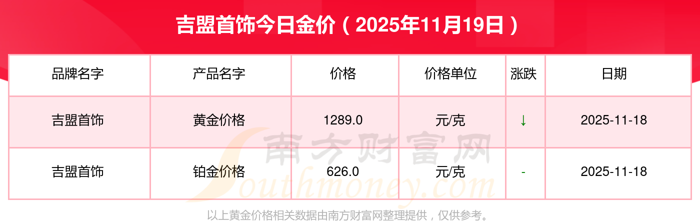 吉盟首饰今日黄金价格行情如何:黄金价格1288.0元/克,铂金价格626.0元/克,饰品金价(内地)1288.0元/克,黄金饰品(香港)44770.0,铂金价格(香港)17820.0,金条价格(香港)40390.0,金条金价(内地)1127.0元/克,黄金价格1285.0元/克,铂金价格600.0元/克,足金价格1285.0元/克,黄金价格1257.0元/克。