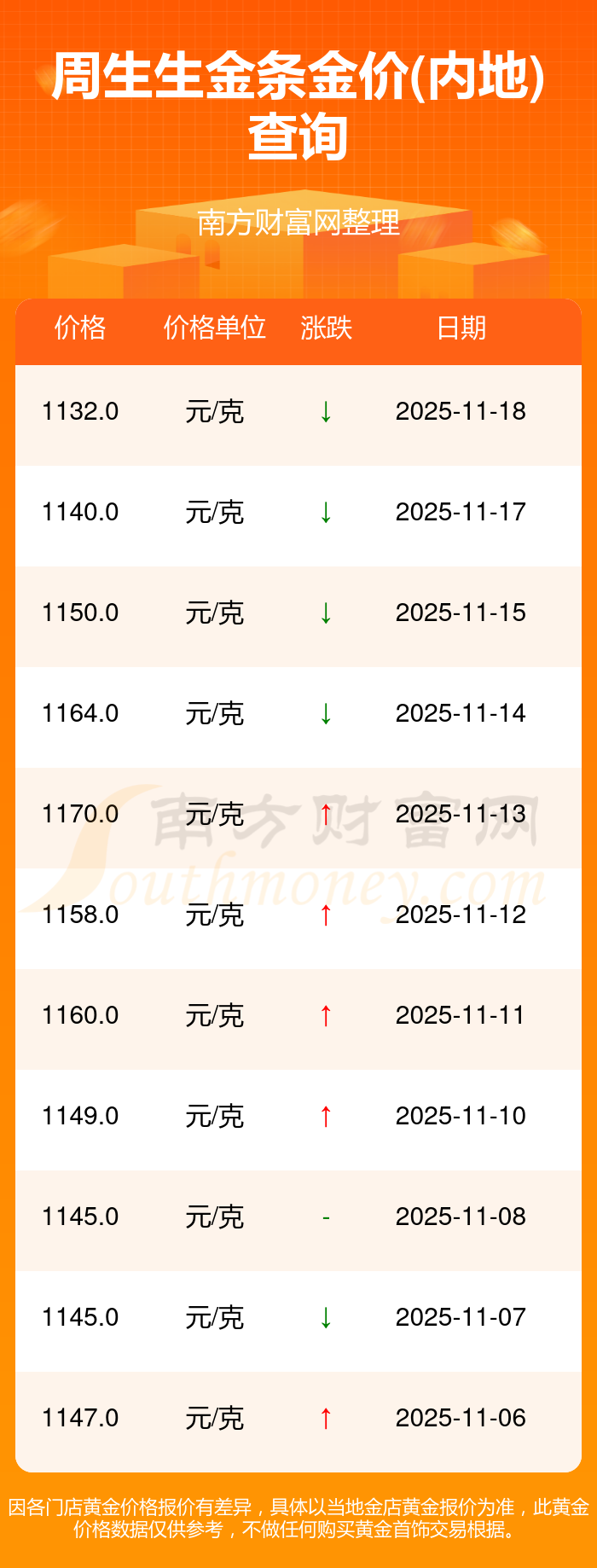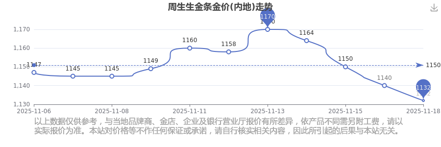 今日(2025年11月19日)周生生金条金价(内地)为1132.0元/克。