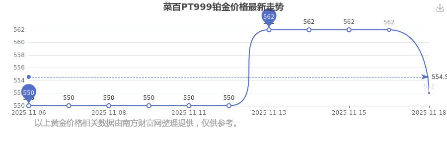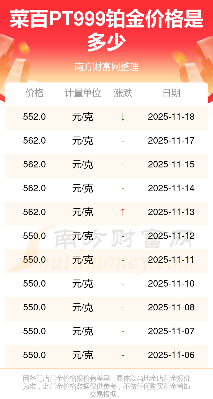 2025年11月19日菜百PT999铂金价格:552.0元/克。