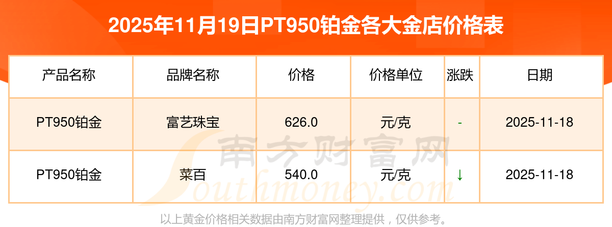 2025年11月19日,周大福、周大福、周大福、周大福、周大福、周大福、周大福、老凤祥、老凤祥、老凤祥、周六福等各大金店品牌PT950铂金今日价格如下:周大福1288.0元/克、周大福626.0元/克、周大福1288.0元/克、周大福44770.0、周大福17820.0、周大福40390.0、周大福1127.0元/克、老凤祥1285.0元/克、老凤祥600.0元/克、老凤祥1285.0元/克、周六福1257.0元/克。