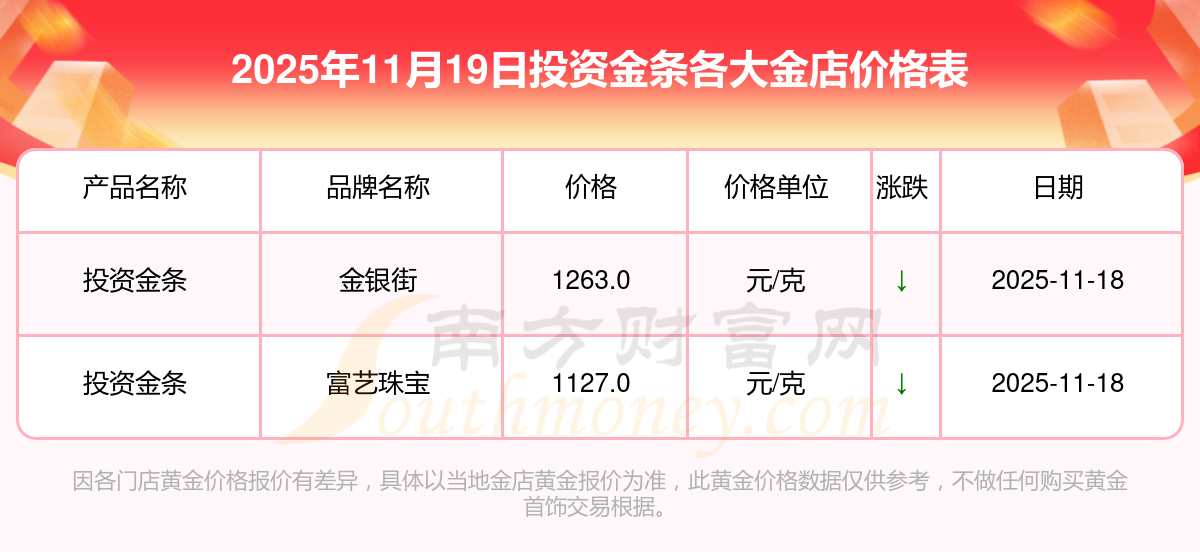 2025年11月19日各大金店投资金条最新价格:周大福1288.0元/克,周大福626.0元/克,周大福1288.0元/克,周大福44770.0,周大福17820.0,周大福40390.0,周大福1127.0元/克,老凤祥1285.0元/克,老凤祥600.0元/克,老凤祥1285.0元/克,周六福1257.0元/克。