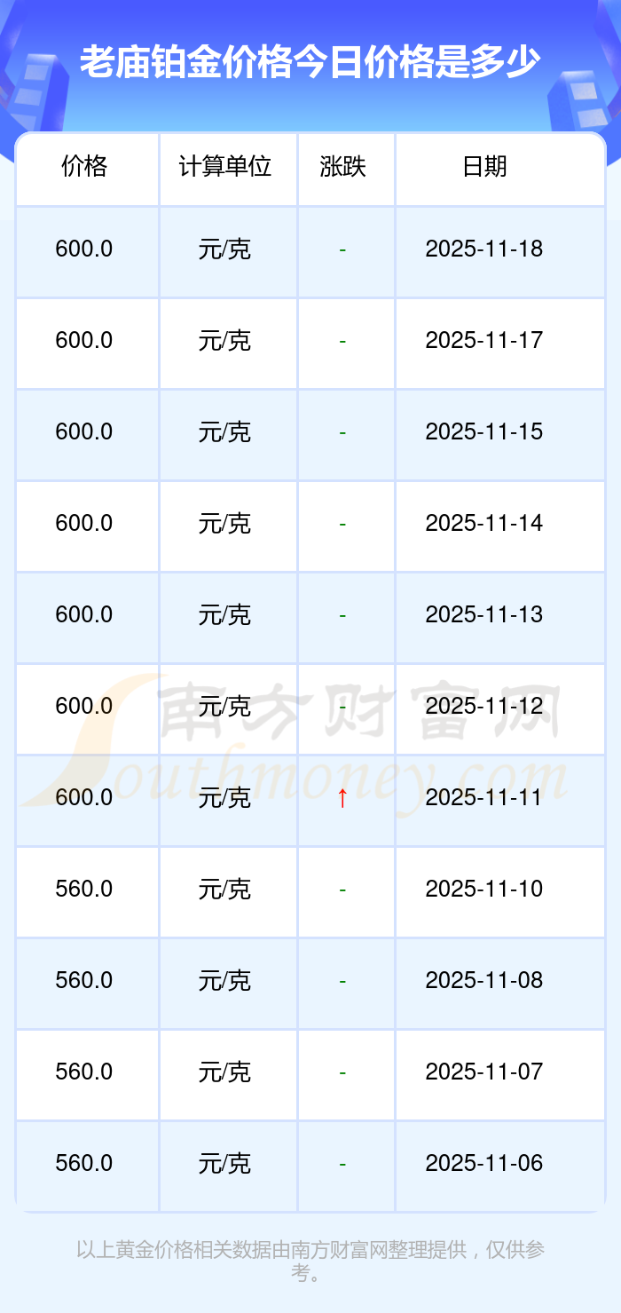 今日(2025年11月19日)老庙铂金价格:600.0元/克。