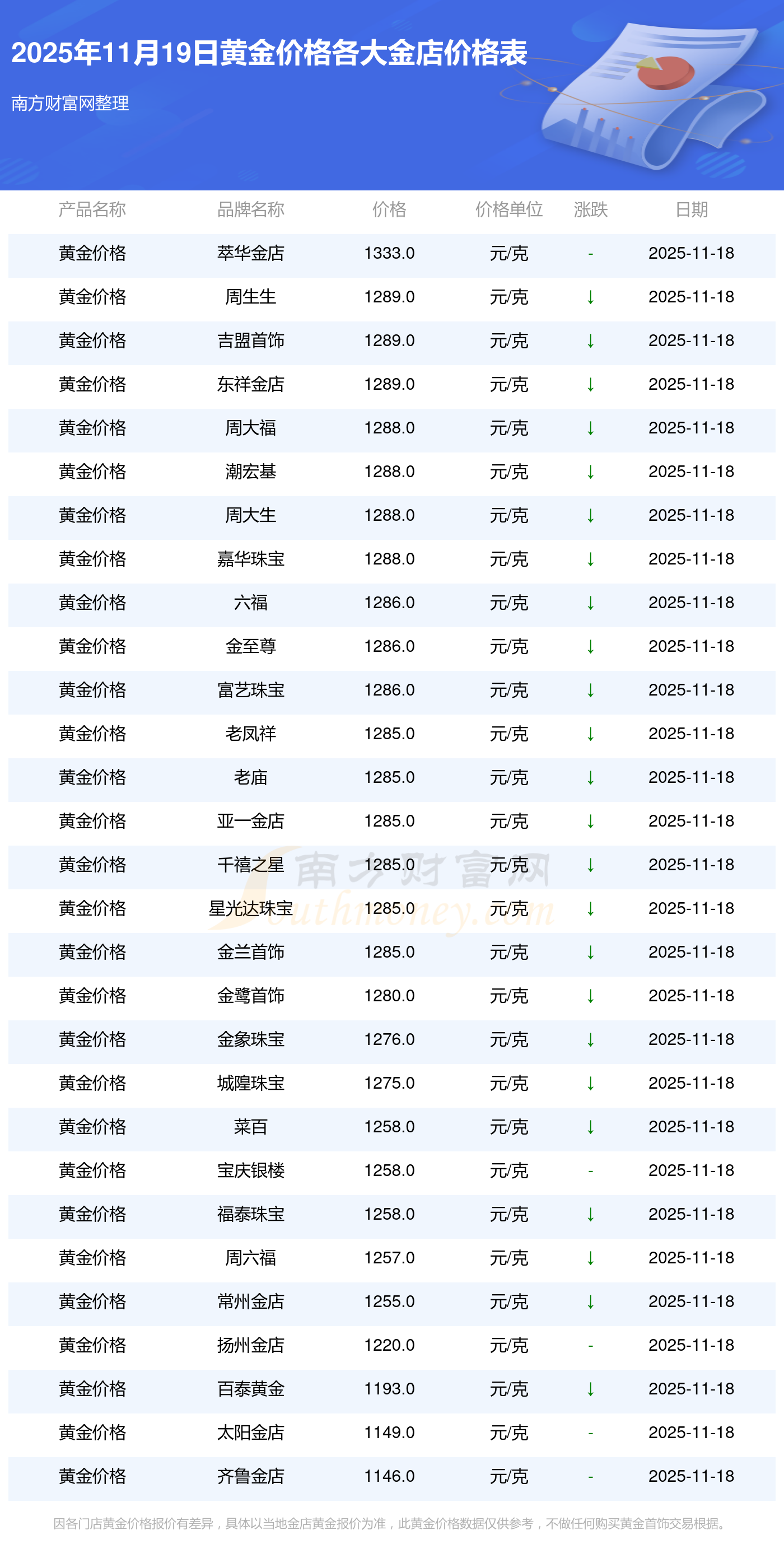 2025年11月19日各大金店黄金价格多少1克?各大金店黄金价格报价表