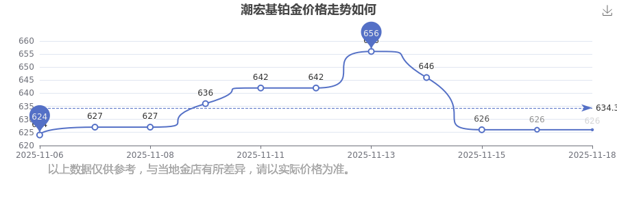 最新数据表明,潮宏基今日 铂金价格为626.0元/克。
