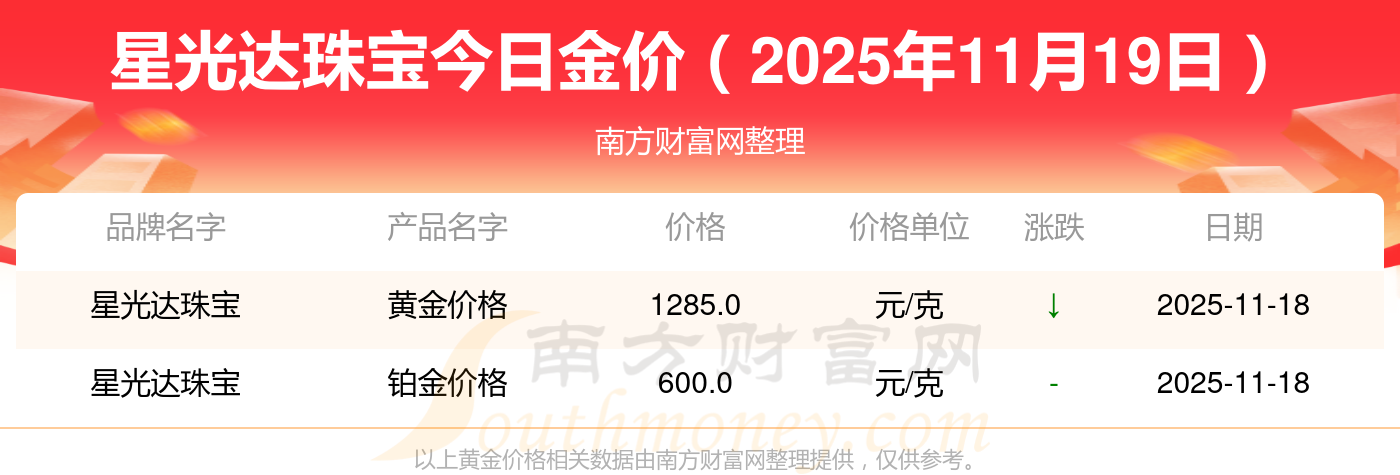 2025年11月19日星光达珠宝今日价格:黄金价格1288.0元/克,铂金价格626.0元/克,饰品金价(内地)1288.0元/克,黄金饰品(香港)44770.0,铂金价格(香港)17820.0,金条价格(香港)40390.0,金条金价(内地)1127.0元/克,黄金价格1285.0元/克,铂金价格600.0元/克,足金价格1285.0元/克,黄金价格1257.0元/克。