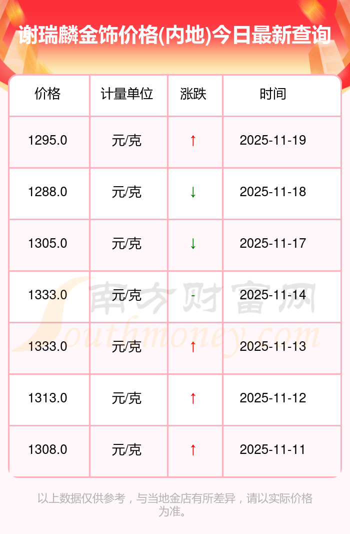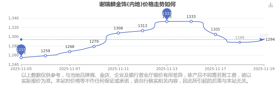 2025年11月19日谢瑞麟金饰(内地)价格:1295.0元/克。