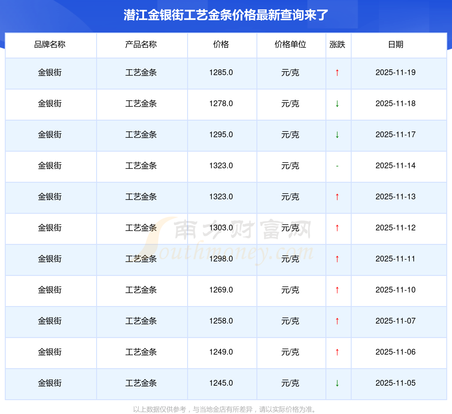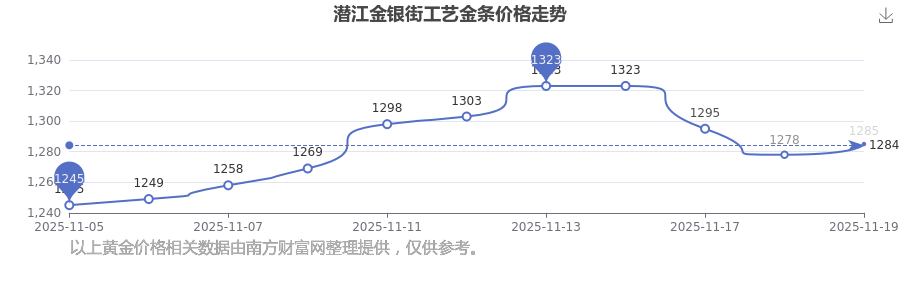 于 2025年11月19日,潜江金银街工艺金条的克价为1285.0元/克。