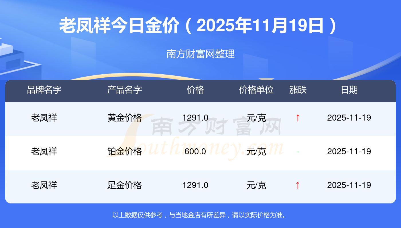 2025年11月19日老凤祥最新价格:黄金价格1295.0元/克,铂金价格619.0元/克,饰品金价(内地)1295.0元/克,黄金饰品(香港)45120.0,铂金价格(香港)17690.0,金条价格(香港)40700.0,金条金价(内地)1133.0元/克,黄金价格1291.0元/克,铂金价格600.0元/克,足金价格1291.0元/克,黄金价格1263.0元/克。