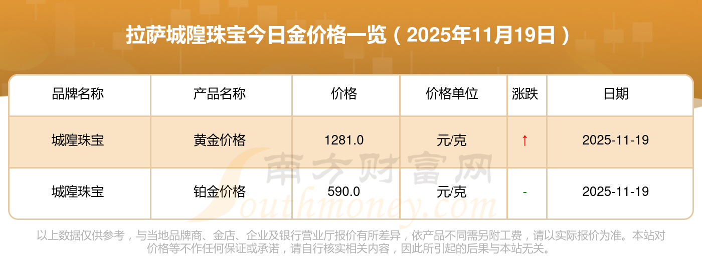 2025年11月19日拉萨城隍珠宝最新价格:黄金价格1295.0元/克,铂金价格619.0元/克,饰品金价(内地)1295.0元/克,黄金饰品(香港)45120.0,铂金价格(香港)17690.0,金条价格(香港)40700.0,金条金价(内地)1133.0元/克,黄金价格1291.0元/克,铂金价格600.0元/克,足金价格1291.0元/克,黄金价格1263.0元/克。