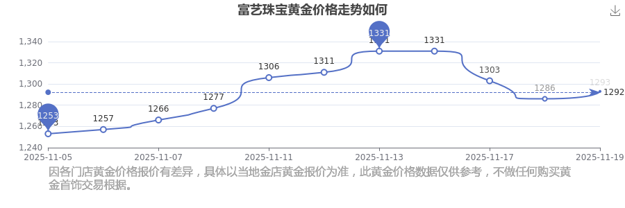 当下,富艺珠宝 黄金价格今日的最新价格是1293.0元/克。