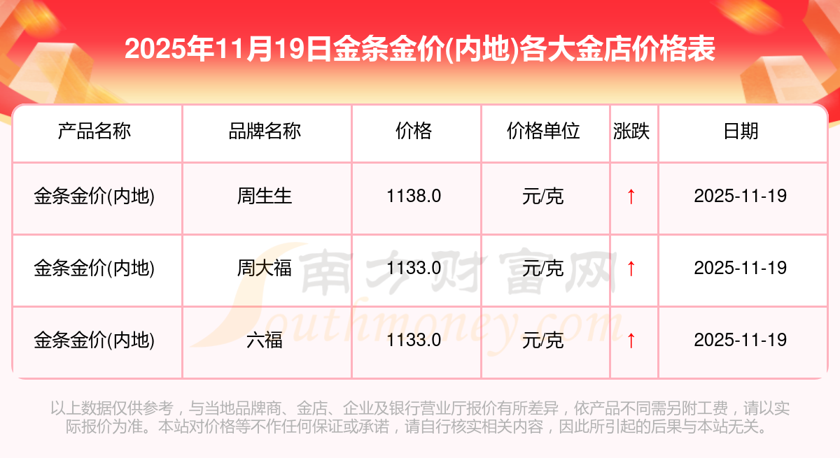 2025年11月19日周大福、周大福、周大福、周大福、周大福、周大福、周大福、老凤祥、老凤祥、老凤祥、周六福等各大金店品牌金条金价(内地)最新价格如下:周大福黄金价格1295.0元/克,周大福铂金价格619.0元/克,周大福饰品金价(内地)1295.0元/克,周大福黄金饰品(香港)45120.0,周大福铂金价格(香港)17690.0,周大福金条价格(香港)40700.0,周大福金条金价(内地)1133.0元/克,老凤祥黄金价格1291.0元/克,老凤祥铂金价格600.0元/克,老凤祥足金价格1291.0元/克,周六福黄金价格1263.0元/克。