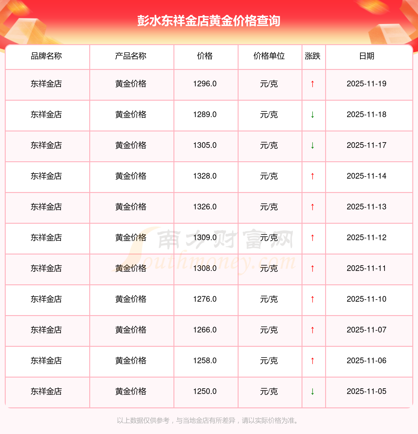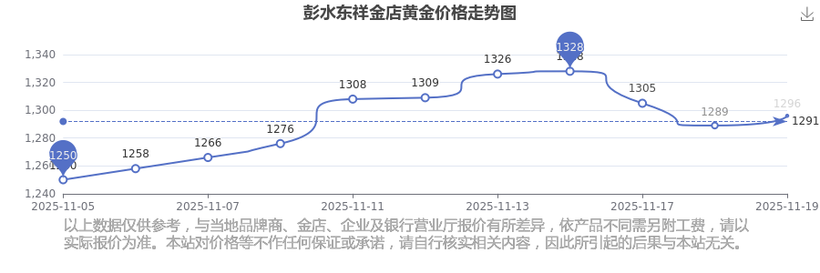 1296.0元/克,此乃彭水东祥金店于 2025年11月19日黄金价格的挂牌价格。