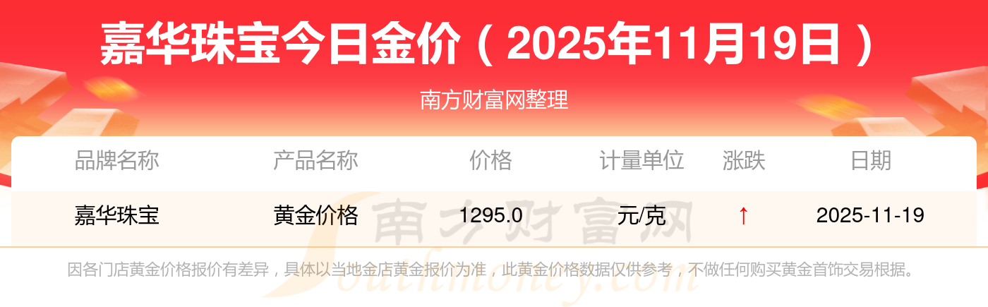 2025年11月19日嘉华珠宝金价查询:黄金价格1295.0元/克,铂金价格619.0元/克,饰品金价(内地)1295.0元/克,黄金饰品(香港)45120.0,铂金价格(香港)17690.0,金条价格(香港)40700.0,金条金价(内地)1133.0元/克,黄金价格1291.0元/克,铂金价格600.0元/克,足金价格1291.0元/克,黄金价格1263.0元/克。