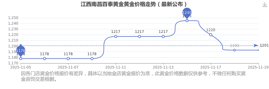 江西南昌百泰黄金今日黄金价格每克多少钱,今天黄金一克在店铺里的售价是多少?今日江西南昌百泰黄金黄金价格查询,今日(2025年11月19日),江西南昌百泰黄金黄金价格的定价为 1193.0元/克。