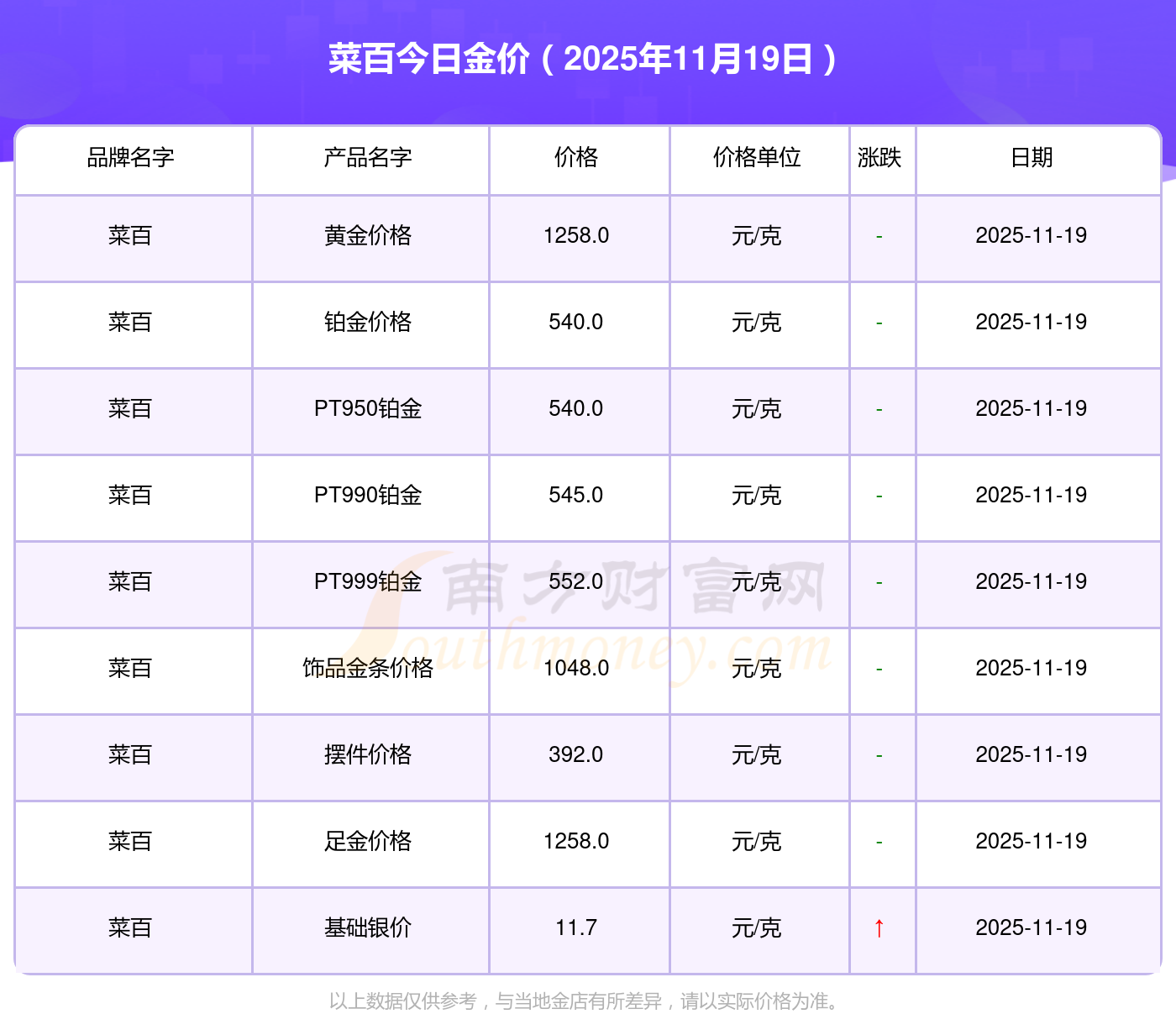 黄金价格1295.0元/克,铂金价格619.0元/克,饰品金价(内地)1295.0元/克,黄金饰品(香港)45120.0,铂金价格(香港)17690.0,金条价格(香港)40700.0,金条金价(内地)1133.0元/克,黄金价格1291.0元/克,铂金价格600.0元/克,足金价格1291.0元/克,黄金价格1263.0元/克。