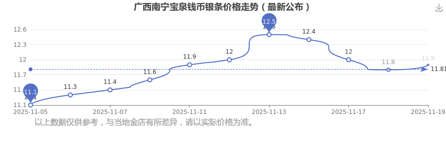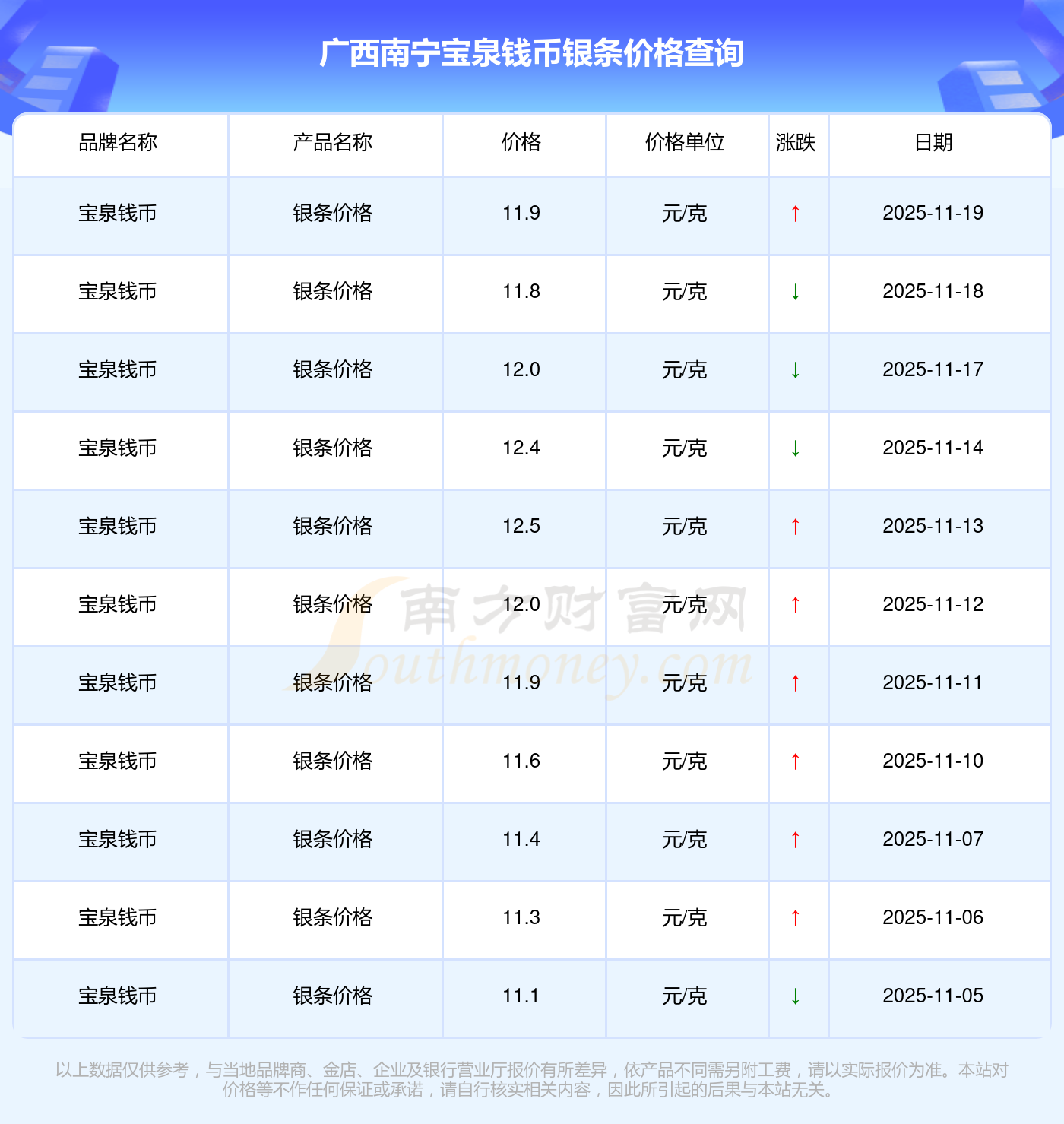 今日(2025年11月19日),广西南宁宝泉钱币银条价格的价格是11.9元/克。