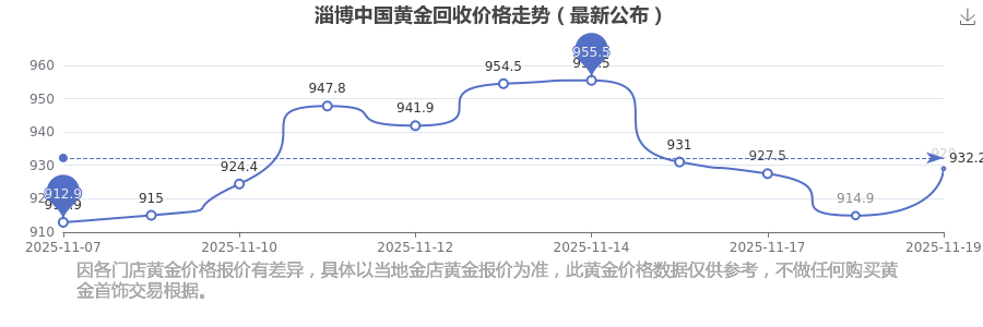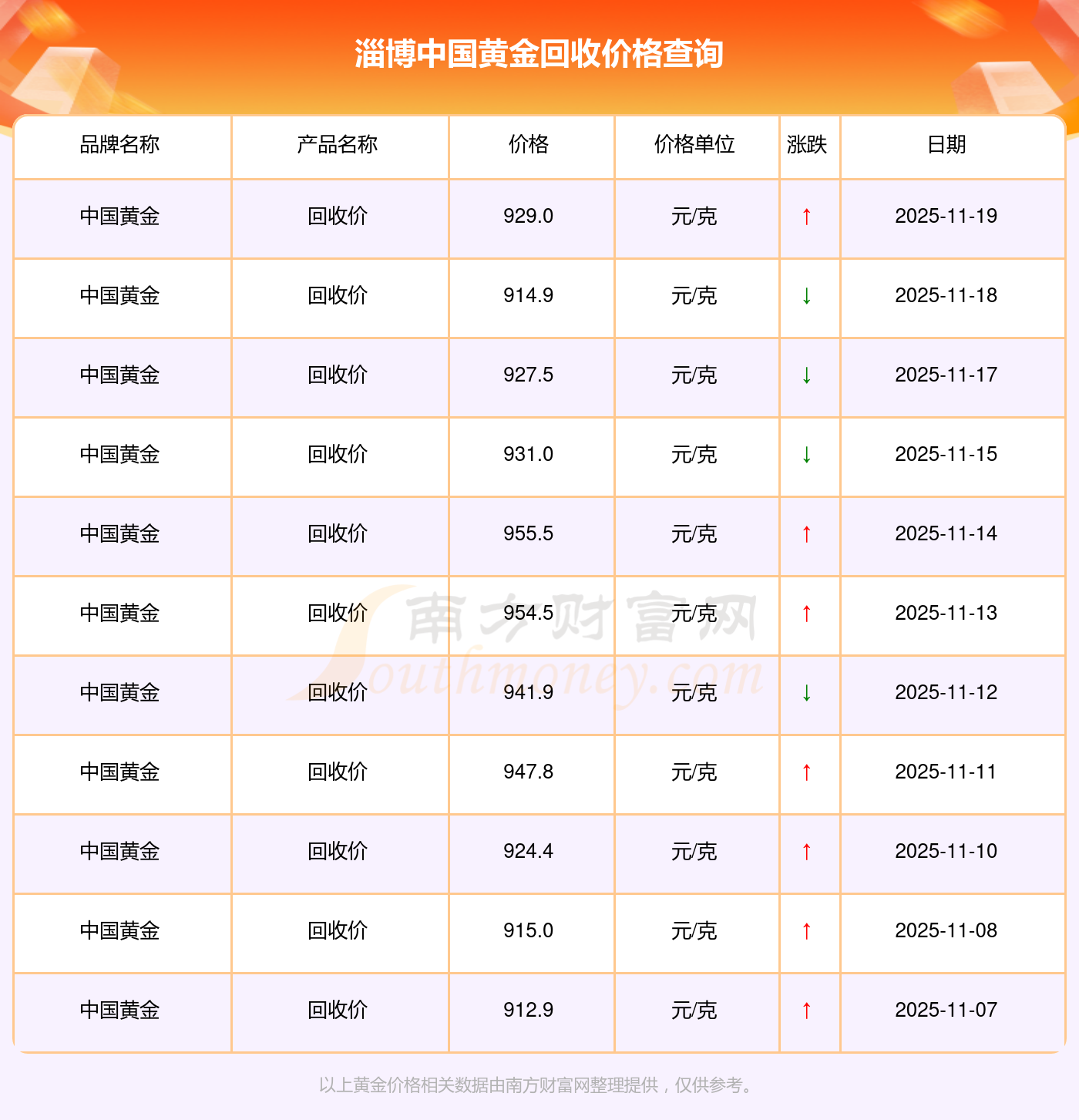 今日(2025年11月19日)淄博中国黄金回收价最新价格为929.0元/克。