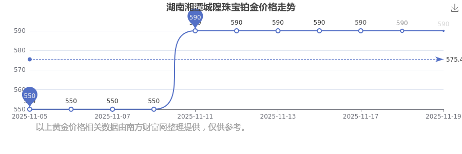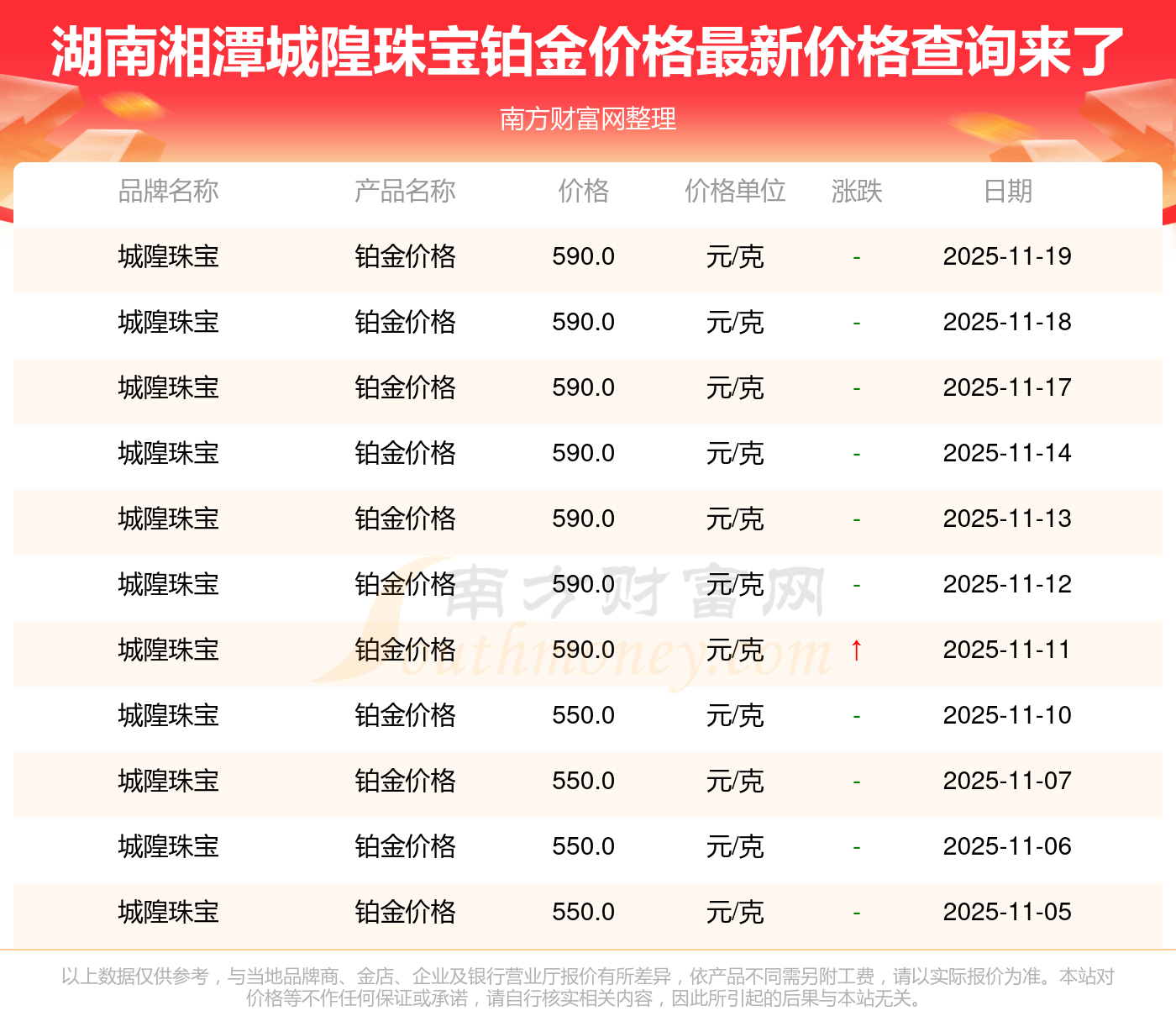 2025年11月19日,湖南湘潭城隍珠宝铂金价格每克的售卖价位为590.0元/克。
