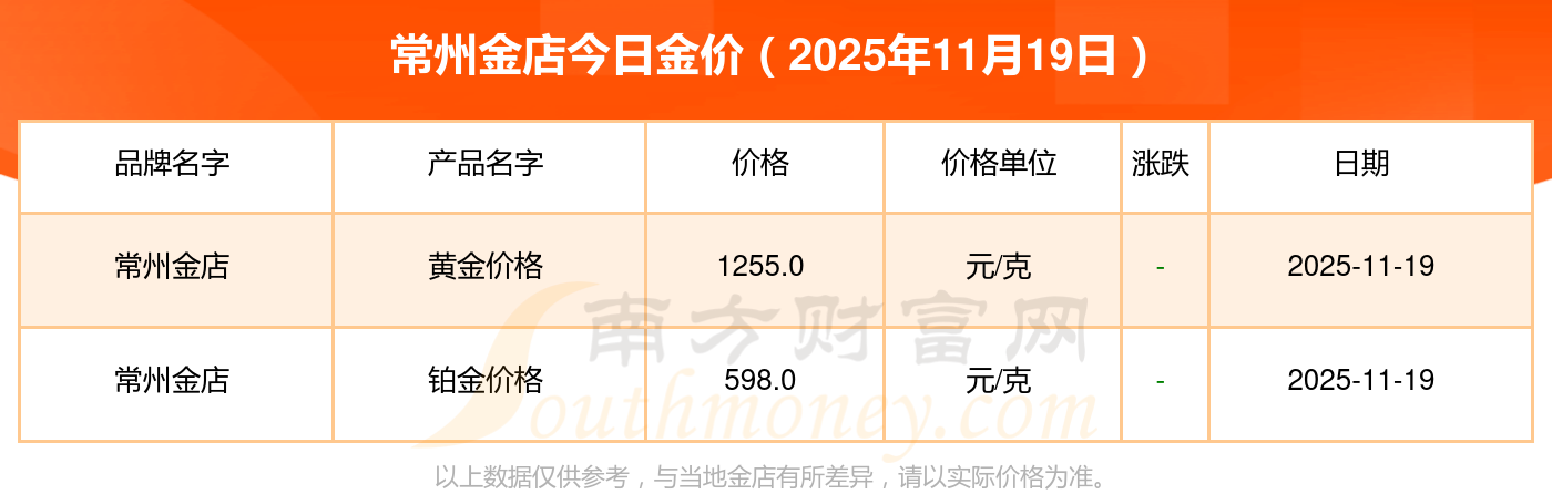 2025年11月19日常州金店今日价格:黄金价格1295.0元/克,铂金价格619.0元/克,饰品金价(内地)1295.0元/克,黄金饰品(香港)45120.0,铂金价格(香港)17690.0,金条价格(香港)40700.0,金条金价(内地)1133.0元/克,黄金价格1291.0元/克,铂金价格600.0元/克,足金价格1291.0元/克,黄金价格1263.0元/克。