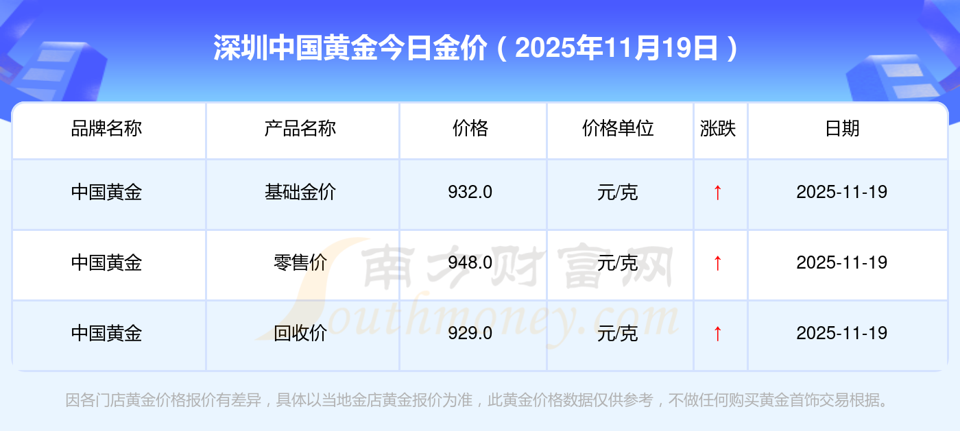 2025年11月19日深圳中国黄金黄金一克的市场行情价是多少?黄金价格1295.0元/克,铂金价格619.0元/克,饰品金价(内地)1295.0元/克,黄金饰品(香港)45120.0,铂金价格(香港)17690.0,金条价格(香港)40700.0,金条金价(内地)1133.0元/克,黄金价格1291.0元/克,铂金价格600.0元/克,足金价格1291.0元/克,黄金价格1263.0元/克。