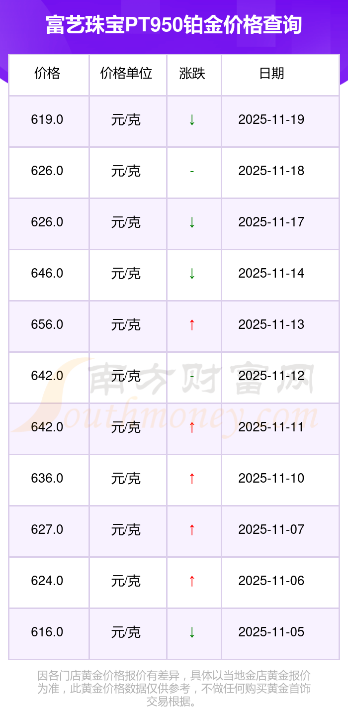 今日富艺珠宝PT950铂金价格:619.0元/克。