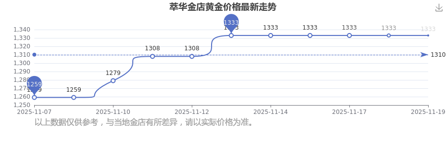 今日黄金价格具体多少?当下每克黄金值多少钱呢?黄金每克的价钱通常来说是多少左右?2025年11月19日萃华金店黄金价格:1333.0元/克。