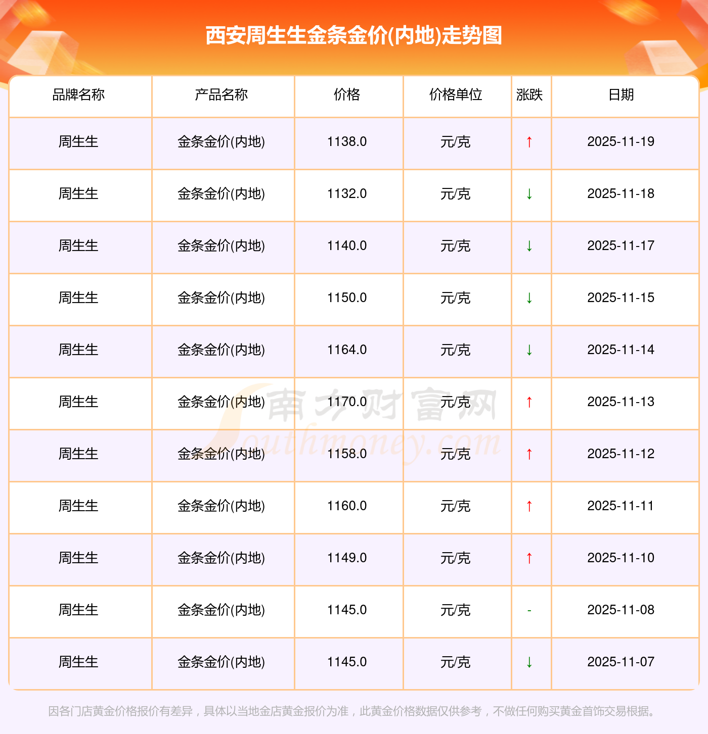2025年11月19日周大福、周大福、周大福、周大福、周大福、周大福、周大福、老凤祥、老凤祥、老凤祥、周六福等各大金店品牌金条金价(内地)最新价格如下:周大福黄金价格1295.0元/克,周大福铂金价格619.0元/克,周大福饰品金价(内地)1295.0元/克,周大福黄金饰品(香港)45120.0,周大福铂金价格(香港)17690.0,周大福金条价格(香港)40700.0,周大福金条金价(内地)1133.0元/克,老凤祥黄金价格1291.0元/克,老凤祥铂金价格600.0元/克,老凤祥足金价格1291.0元/克,周六福黄金价格1263.0元/克。