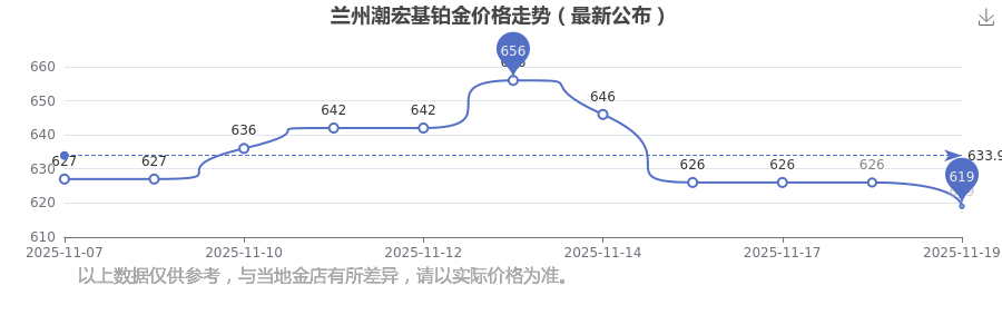今日2025年11月19日,兰州潮宏基铂金价格为619.0元/克。
