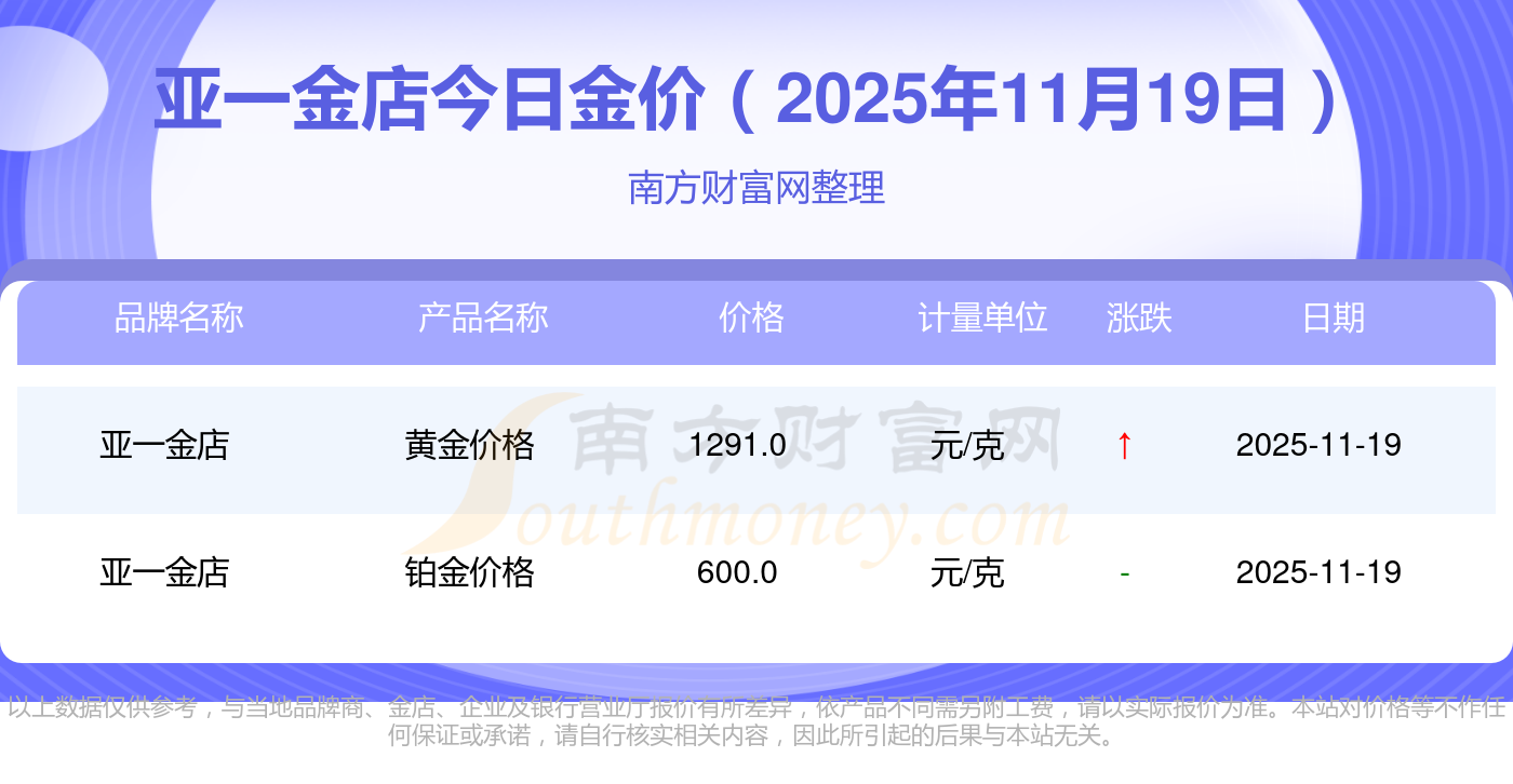 2025年11月19日亚一金店金价查询:黄金价格1295.0元/克,铂金价格619.0元/克,饰品金价(内地)1295.0元/克,黄金饰品(香港)45120.0,铂金价格(香港)17690.0,金条价格(香港)40700.0,金条金价(内地)1133.0元/克,黄金价格1291.0元/克,铂金价格600.0元/克,足金价格1291.0元/克,黄金价格1263.0元/克。