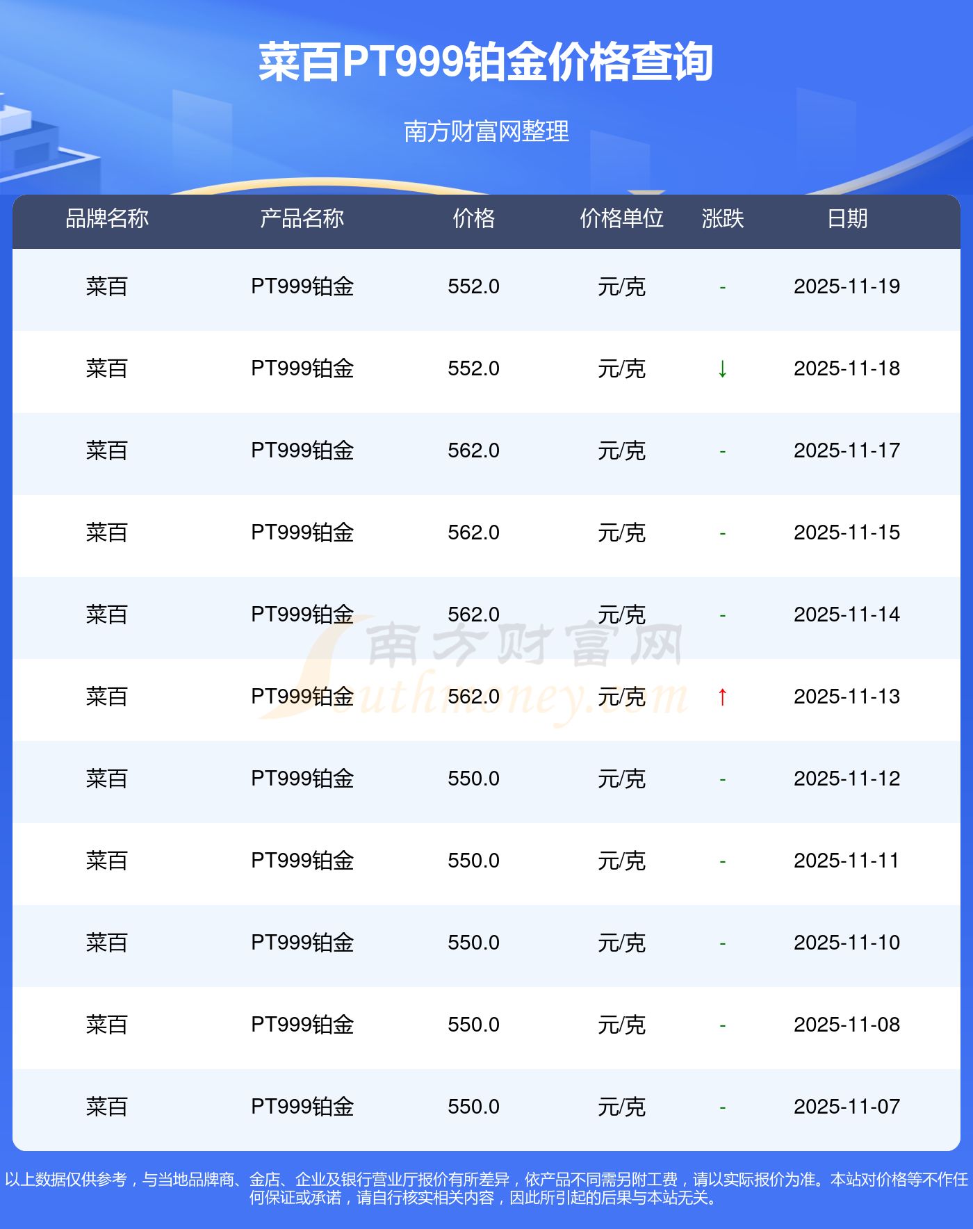 今日(2025年11月19日),菜百PT999铂金价格:552.0元/克。