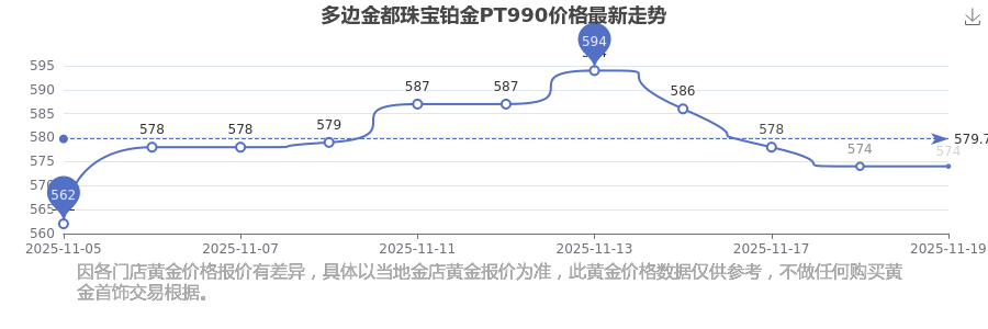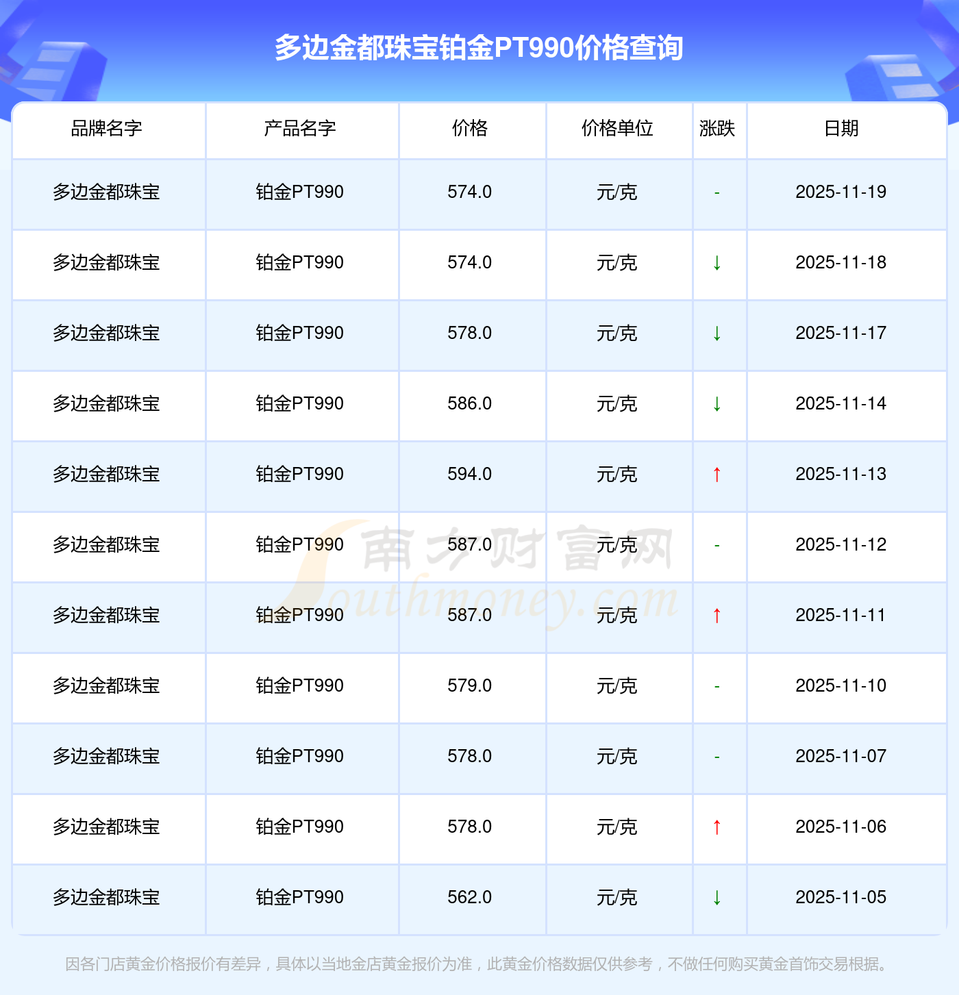 据了解,今日多边金都珠宝 铂金PT990的最新价格为574.0元/克。