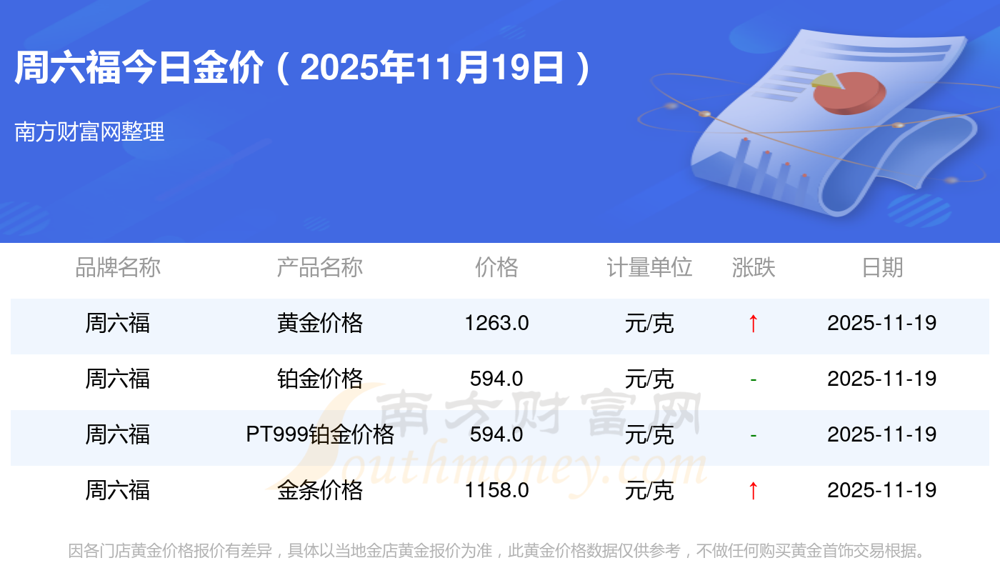 2025年11月19日周六福最新价格:黄金价格1295.0元/克,铂金价格619.0元/克,饰品金价(内地)1295.0元/克,黄金饰品(香港)45120.0,铂金价格(香港)17690.0,金条价格(香港)40700.0,金条金价(内地)1133.0元/克,黄金价格1291.0元/克,铂金价格600.0元/克,足金价格1291.0元/克,黄金价格1263.0元/克。