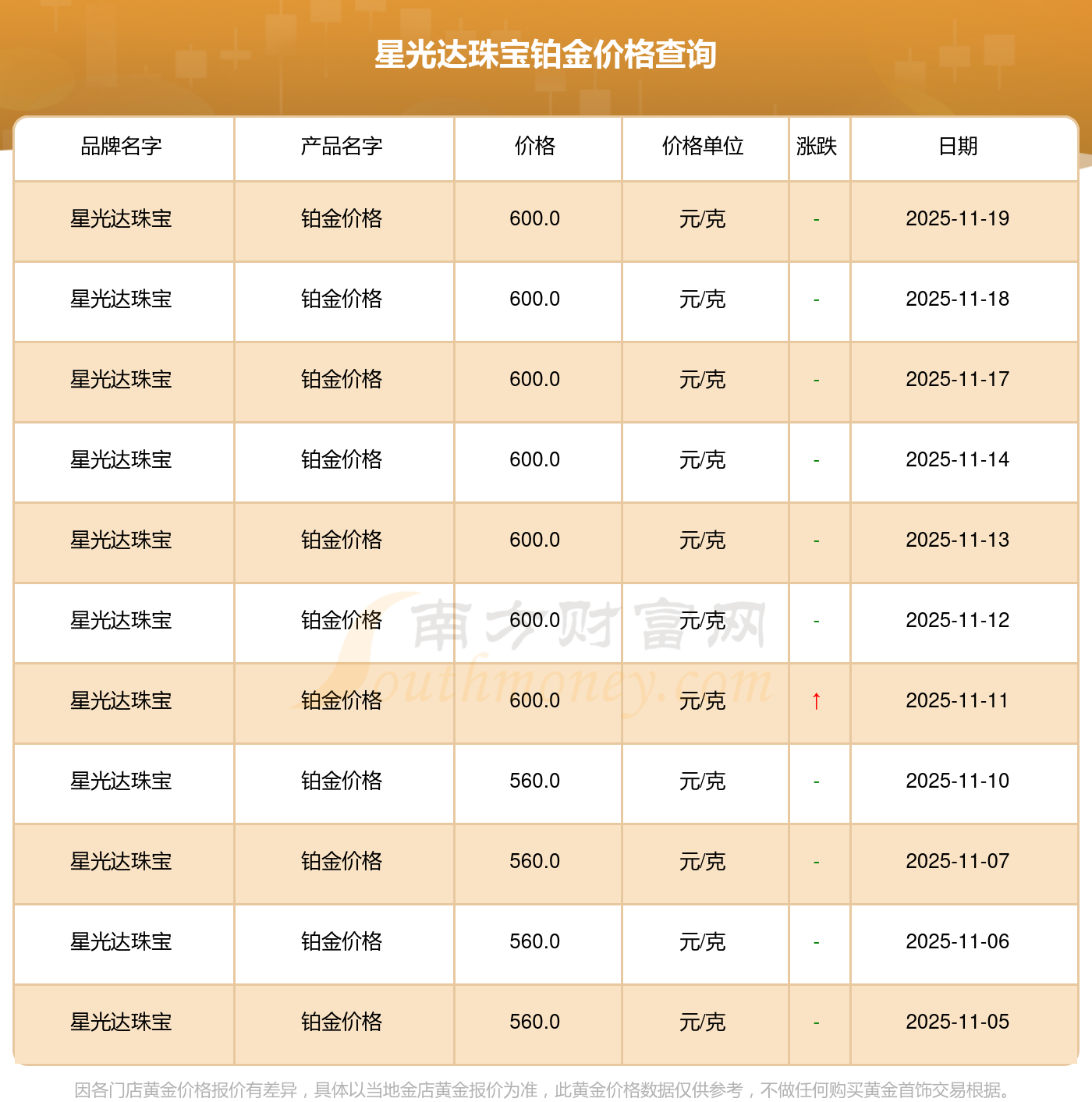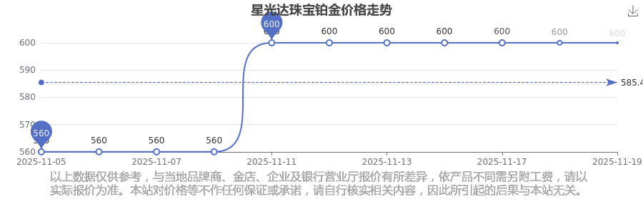 今日星光达珠宝 铂金价格的最新定价为600.0元/克。