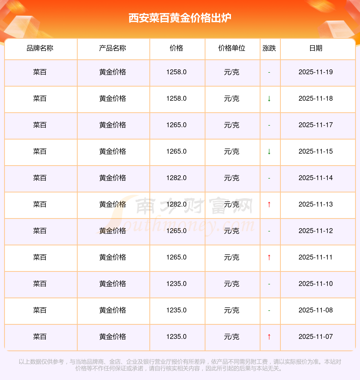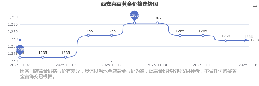 2025年11月19日,西安菜百黄金价格每克的售卖价位为1258.0元/克。