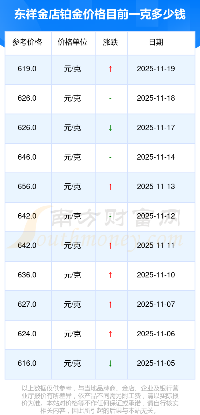 619.0元/克是东祥金店在今日给出的 铂金价格最新价格。