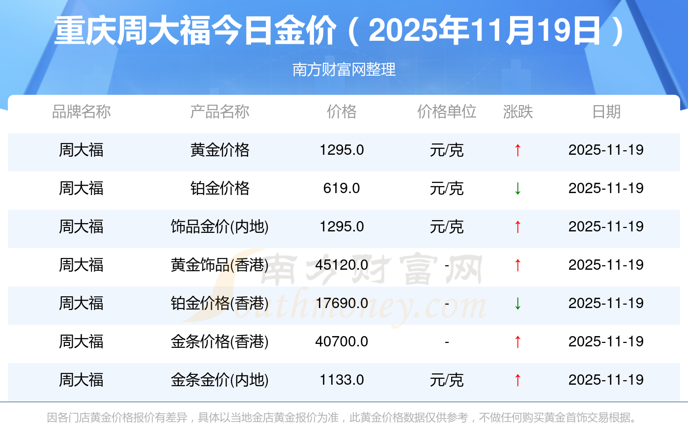 今日黄金价格情况如何?此刻黄金一克要多少钱?2025年11月19日重庆周大福黄金的单价,一克为多少?黄金价格1295.0元/克,铂金价格619.0元/克,饰品金价(内地)1295.0元/克,黄金饰品(香港)45120.0,铂金价格(香港)17690.0,金条价格(香港)40700.0,金条金价(内地)1133.0元/克,黄金价格1291.0元/克,铂金价格600.0元/克,足金价格1291.0元/克,黄金价格1263.0元/克。