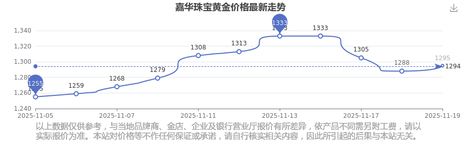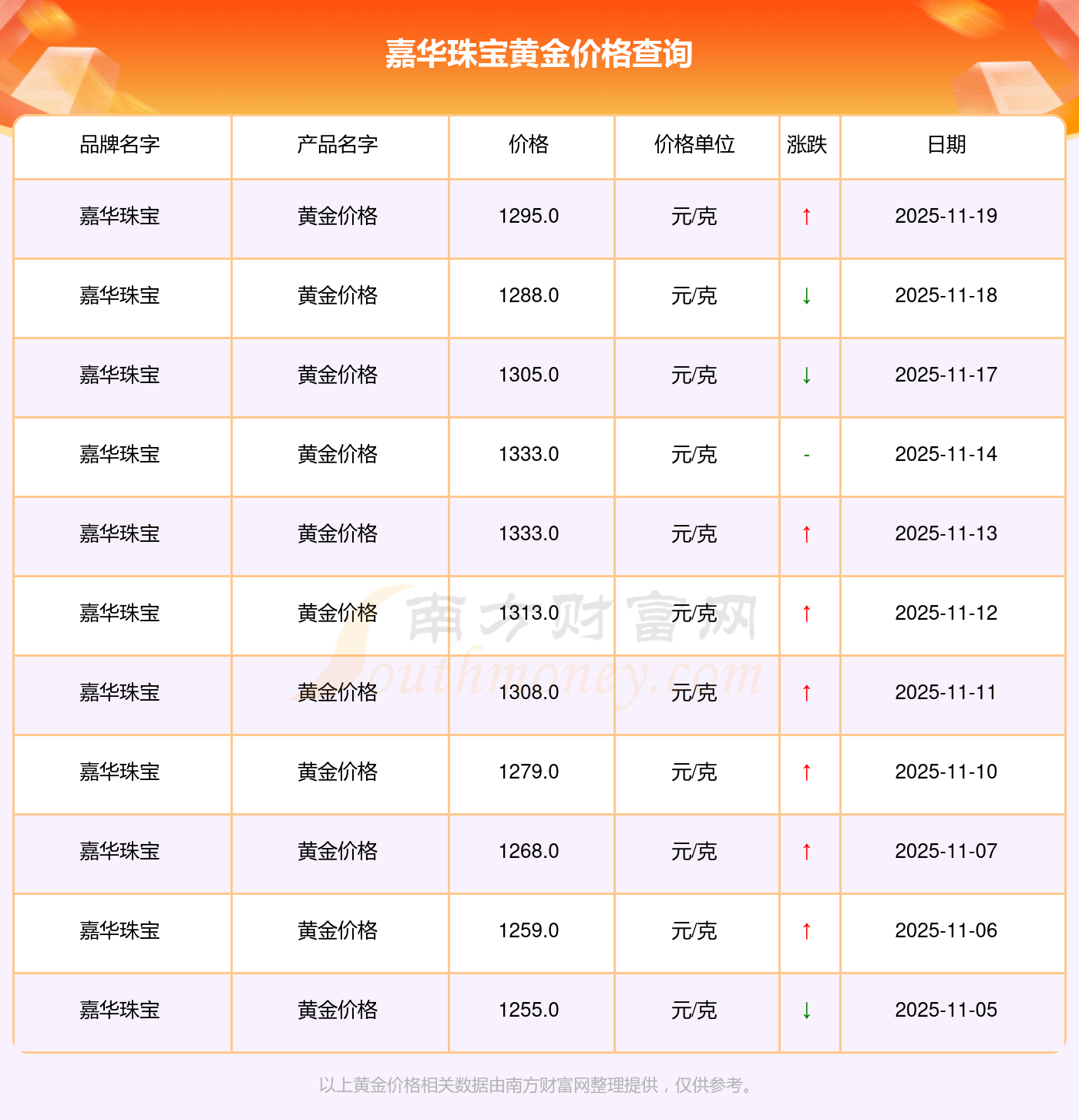 今日嘉华珠宝黄金价格:1295.0元/克。