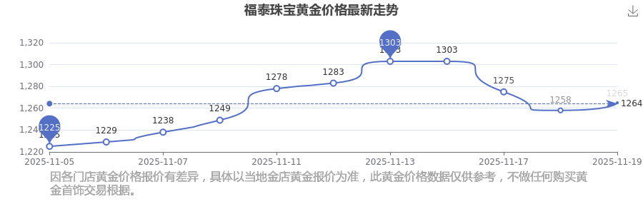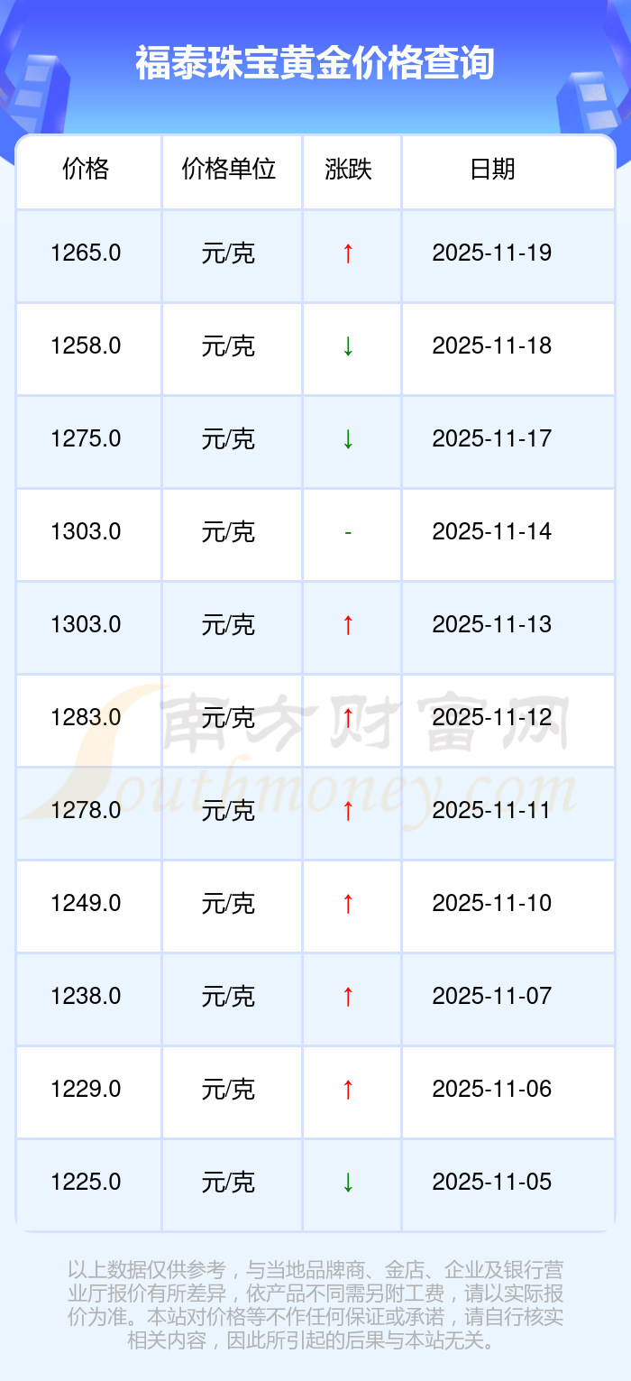 今日(2025年11月19日)福泰珠宝黄金价格是1265.0元/克。