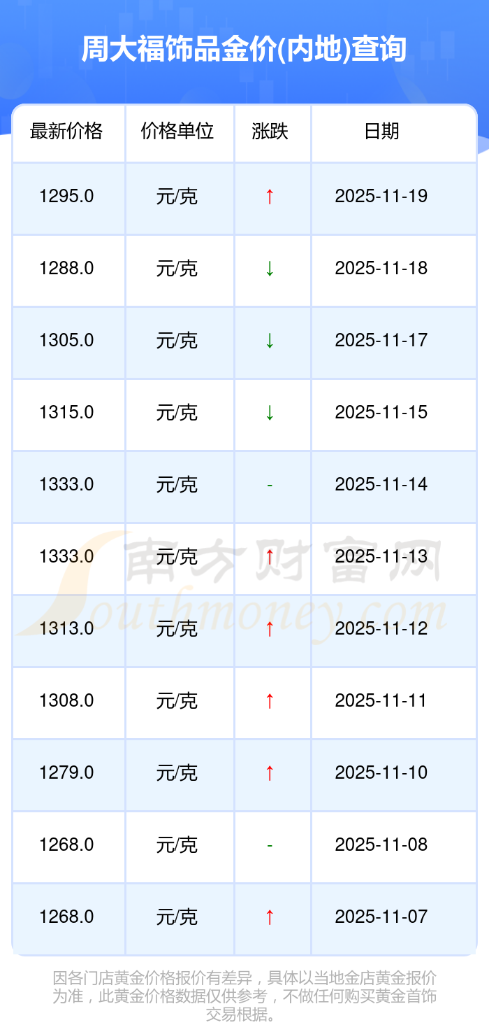 今日周大福饰品金价(内地)最新是1295.0元/克。