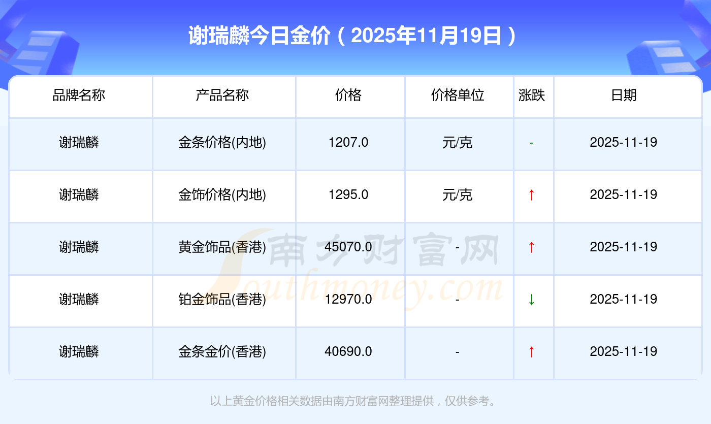 现在谢瑞麟黄金价格是多少钱1克_2025年谢瑞麟今日金价是多少钱一克,最新谢瑞麟查询,2025年11月19日谢瑞麟金饰价格(内地)现在每克多少钱?最新谢瑞麟金饰价格(内地)报价公布,一起来看看吧!