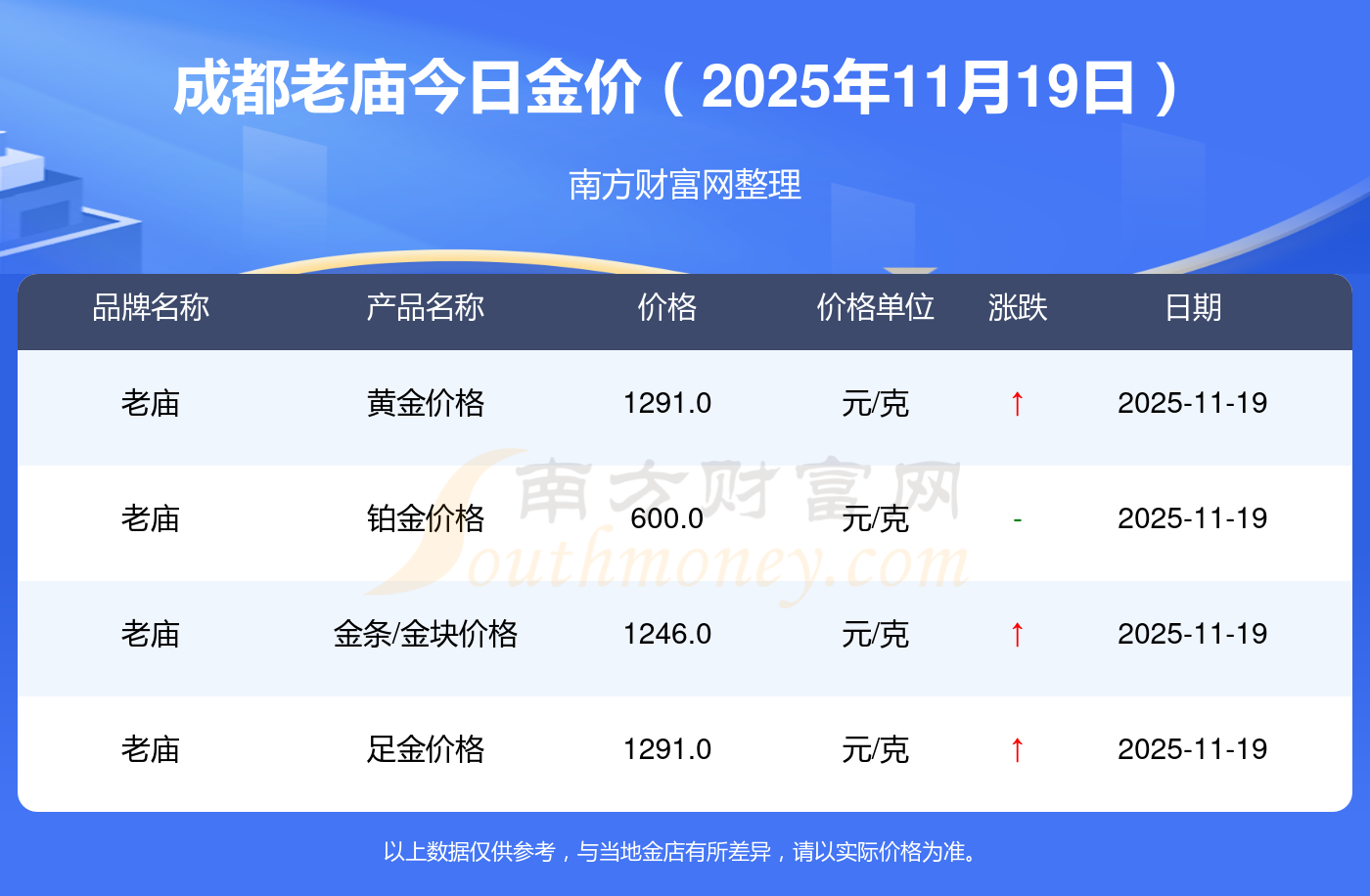 今日黄金价格查询_现在金价黄金一克多少钱,黄金价格是多少钱一克?2025年11月19日成都老庙黄金的单价,一克为多少?黄金价格1295.0元/克,铂金价格619.0元/克,饰品金价(内地)1295.0元/克,黄金饰品(香港)45120.0,铂金价格(香港)17690.0,金条价格(香港)40700.0,金条金价(内地)1133.0元/克,黄金价格1291.0元/克,铂金价格600.0元/克,足金价格1291.0元/克,黄金价格1263.0元/克。