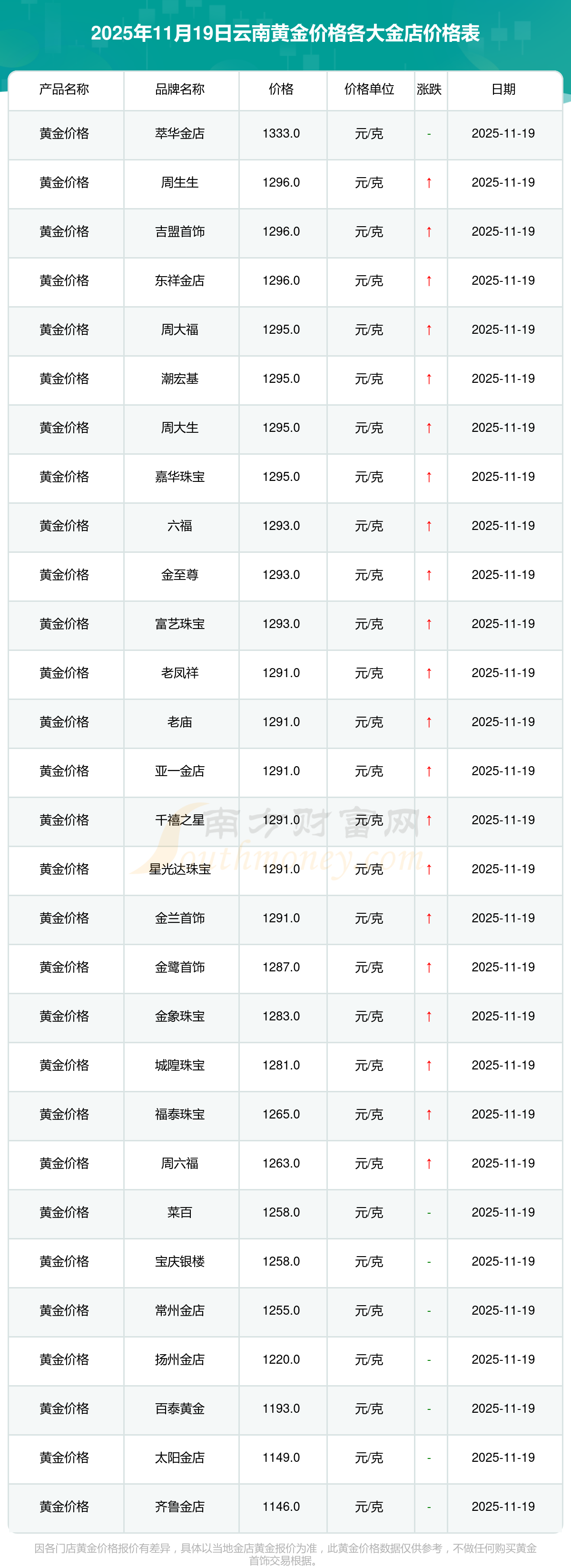 2025年11月19日云南周大福、周大福、周大福、周大福、周大福、周大福、周大福、老凤祥、老凤祥、老凤祥、周六福等各大金店品牌黄金价格最新价格如下:周大福黄金价格1295.0元/克,周大福铂金价格619.0元/克,周大福饰品金价(内地)1295.0元/克,周大福黄金饰品(香港)45120.0,周大福铂金价格(香港)17690.0,周大福金条价格(香港)40700.0,周大福金条金价(内地)1133.0元/克,老凤祥黄金价格1291.0元/克,老凤祥铂金价格600.0元/克,老凤祥足金价格1291.0元/克,周六福黄金价格1263.0元/克。