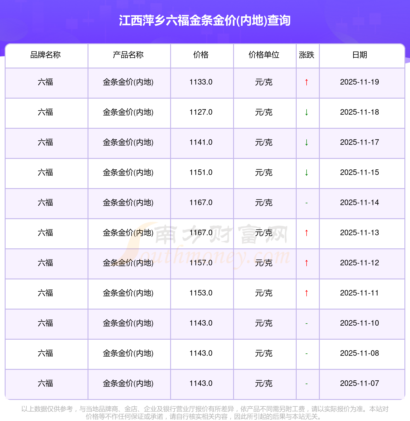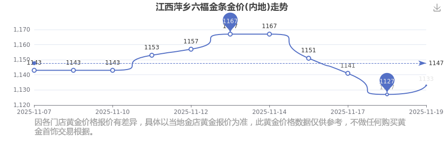 江西萍乡六福的金条金价(内地)在今日(2025年11月19日),每克售价为1133.0元/克。