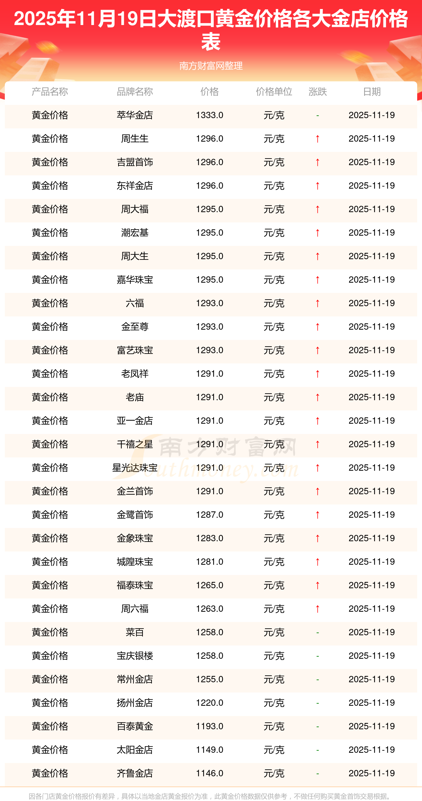2025年11月19日,大渡口周大福、周大福、周大福、周大福、周大福、周大福、周大福、老凤祥、老凤祥、老凤祥、周六福等各大金店品牌黄金价格今日价格行情最新来了:周大福1295.0元/克、周大福619.0元/克、周大福1295.0元/克、周大福45120.0、周大福17690.0、周大福40700.0、周大福1133.0元/克、老凤祥1291.0元/克、老凤祥600.0元/克、老凤祥1291.0元/克、周六福1263.0元/克。
