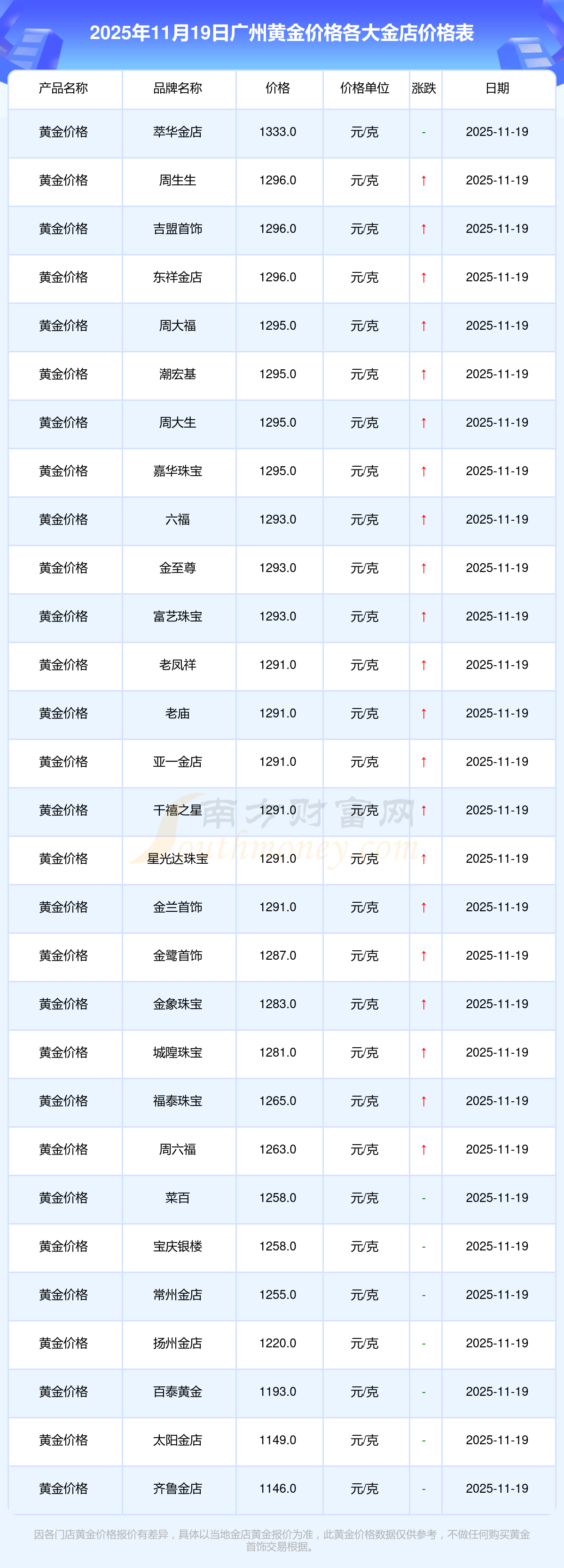 2025年11月19日广州周大福、周大福、周大福、周大福、周大福、周大福、周大福、老凤祥、老凤祥、老凤祥、周六福等各大金店品牌黄金价格最新价格如下:周大福黄金价格1295.0元/克,周大福铂金价格619.0元/克,周大福饰品金价(内地)1295.0元/克,周大福黄金饰品(香港)45120.0,周大福铂金价格(香港)17690.0,周大福金条价格(香港)40700.0,周大福金条金价(内地)1133.0元/克,老凤祥黄金价格1291.0元/克,老凤祥铂金价格600.0元/克,老凤祥足金价格1291.0元/克,周六福黄金价格1263.0元/克。