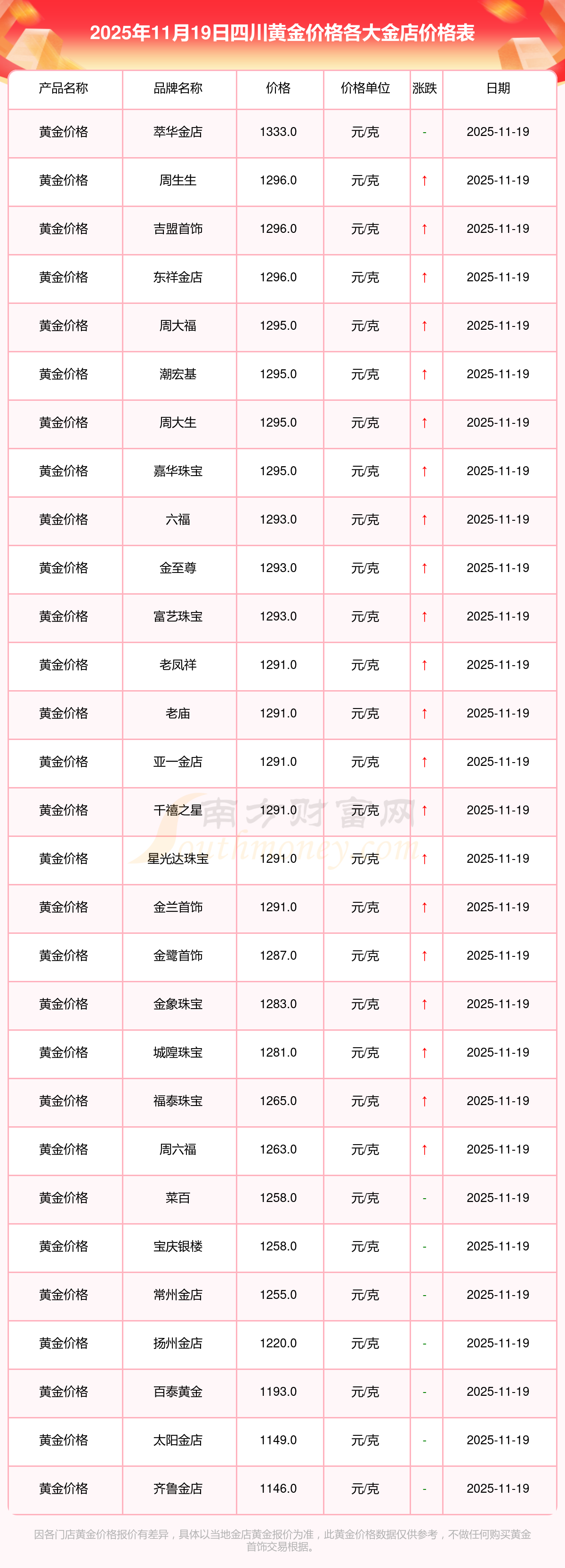今天是2025年11月19日,四川周大福、周大福、周大福、周大福、周大福、周大福、周大福、老凤祥、老凤祥、老凤祥、周六福等各大金店品牌黄金价格最新价格行情是这样的:周大福1295.0元/克、周大福619.0元/克、周大福1295.0元/克、周大福45120.0、周大福17690.0、周大福40700.0、周大福1133.0元/克、老凤祥1291.0元/克、老凤祥600.0元/克、老凤祥1291.0元/克、周六福1263.0元/克。
