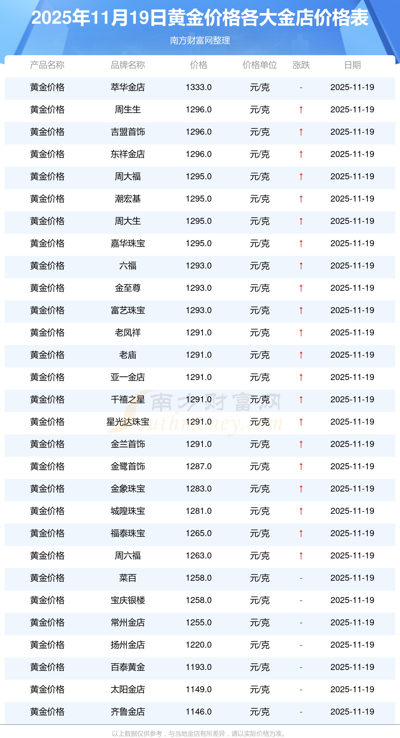 2025年11月19日周大福、周大福、周大福、周大福、周大福、周大福、周大福、老凤祥、老凤祥、老凤祥、周六福等各大金店品牌黄金价格最新价格如下:周大福黄金价格1295.0元/克,周大福铂金价格619.0元/克,周大福饰品金价(内地)1295.0元/克,周大福黄金饰品(香港)45120.0,周大福铂金价格(香港)17690.0,周大福金条价格(香港)40700.0,周大福金条金价(内地)1133.0元/克,老凤祥黄金价格1291.0元/克,老凤祥铂金价格600.0元/克,老凤祥足金价格1291.0元/克,周六福黄金价格1263.0元/克。