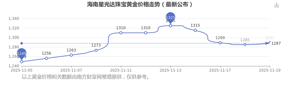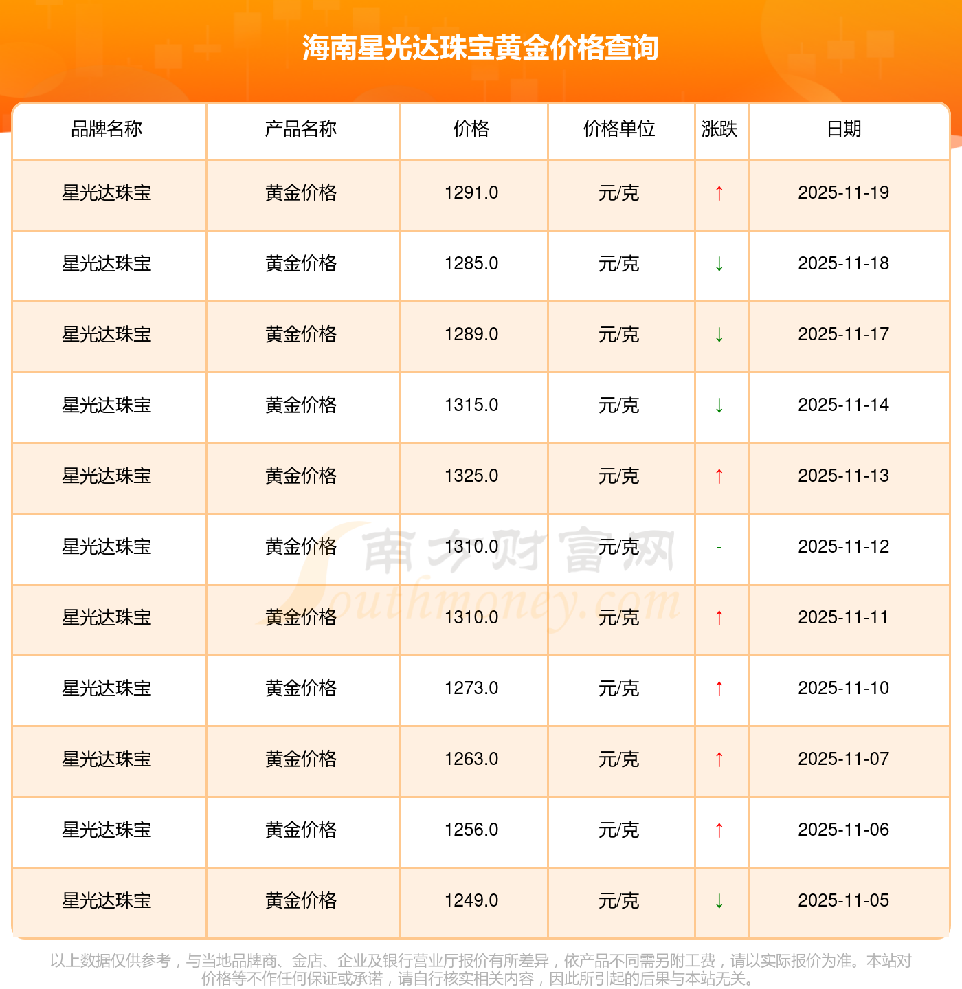 于 2025年11月19日,海南星光达珠宝黄金价格的克价为1291.0元/克。