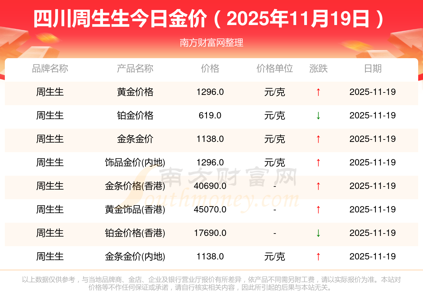 当下黄金每克值多少?2025年11月19日四川周生生黄金按克计价,现在多少钱一克?黄金价格1295.0元/克,铂金价格619.0元/克,饰品金价(内地)1295.0元/克,黄金饰品(香港)45120.0,铂金价格(香港)17690.0,金条价格(香港)40700.0,金条金价(内地)1133.0元/克,黄金价格1291.0元/克,铂金价格600.0元/克,足金价格1291.0元/克,黄金价格1263.0元/克。