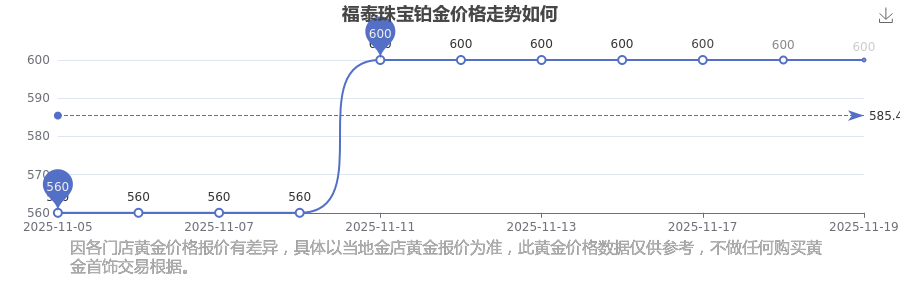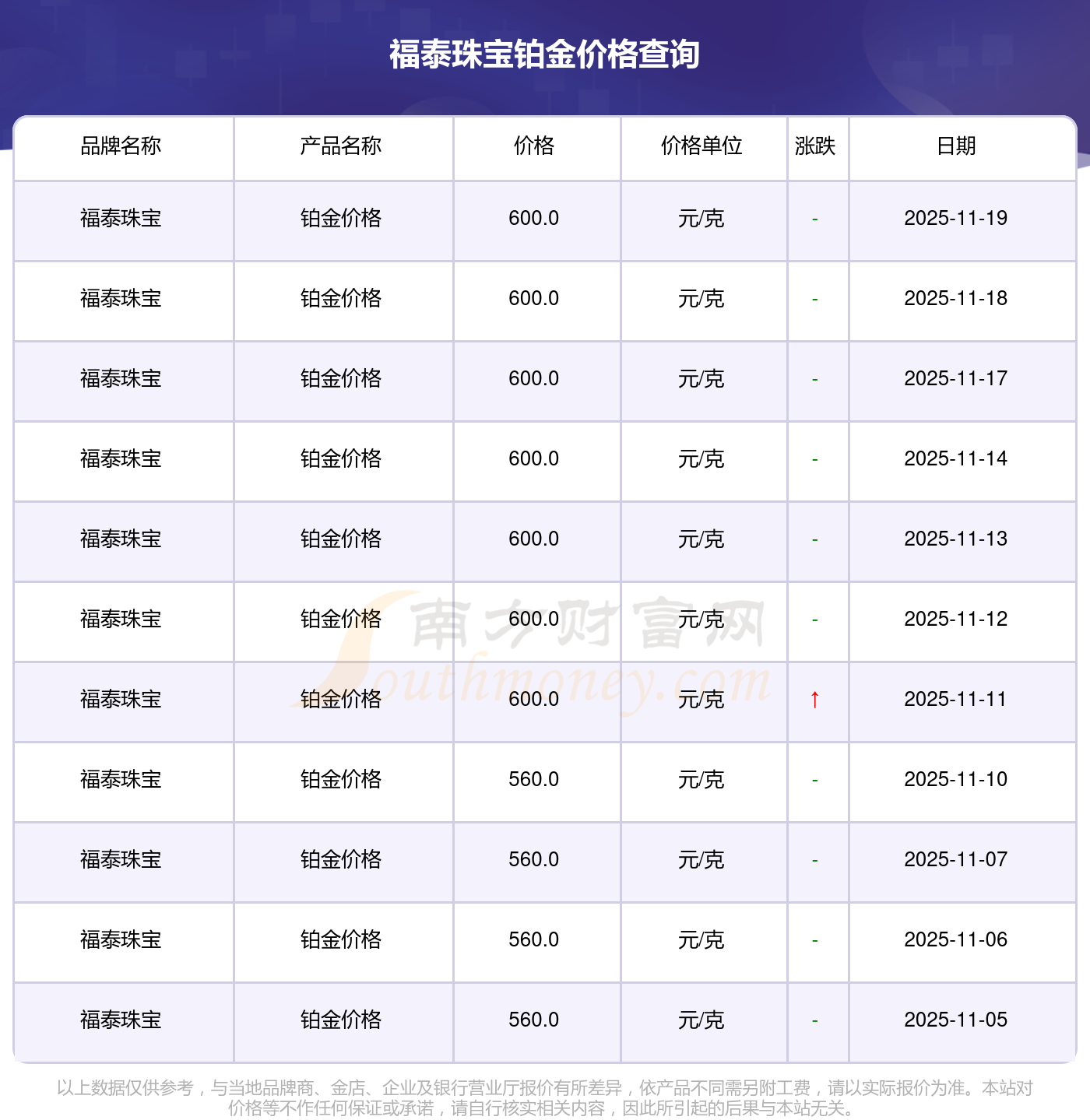2025年11月19日福泰珠宝铂金价格:600.0元/克。